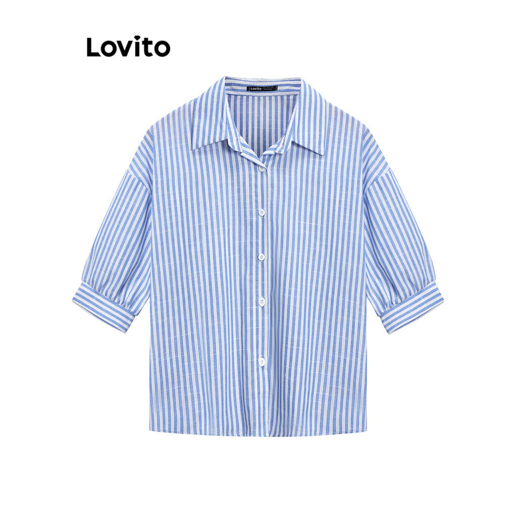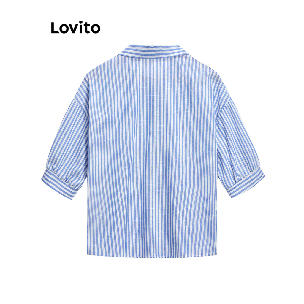 (LIVE STREAM SALE) Lovito Blusa de Algodão com Botões de Listras e Colarinho para Mulheres L59ED052 (Multicolorido)