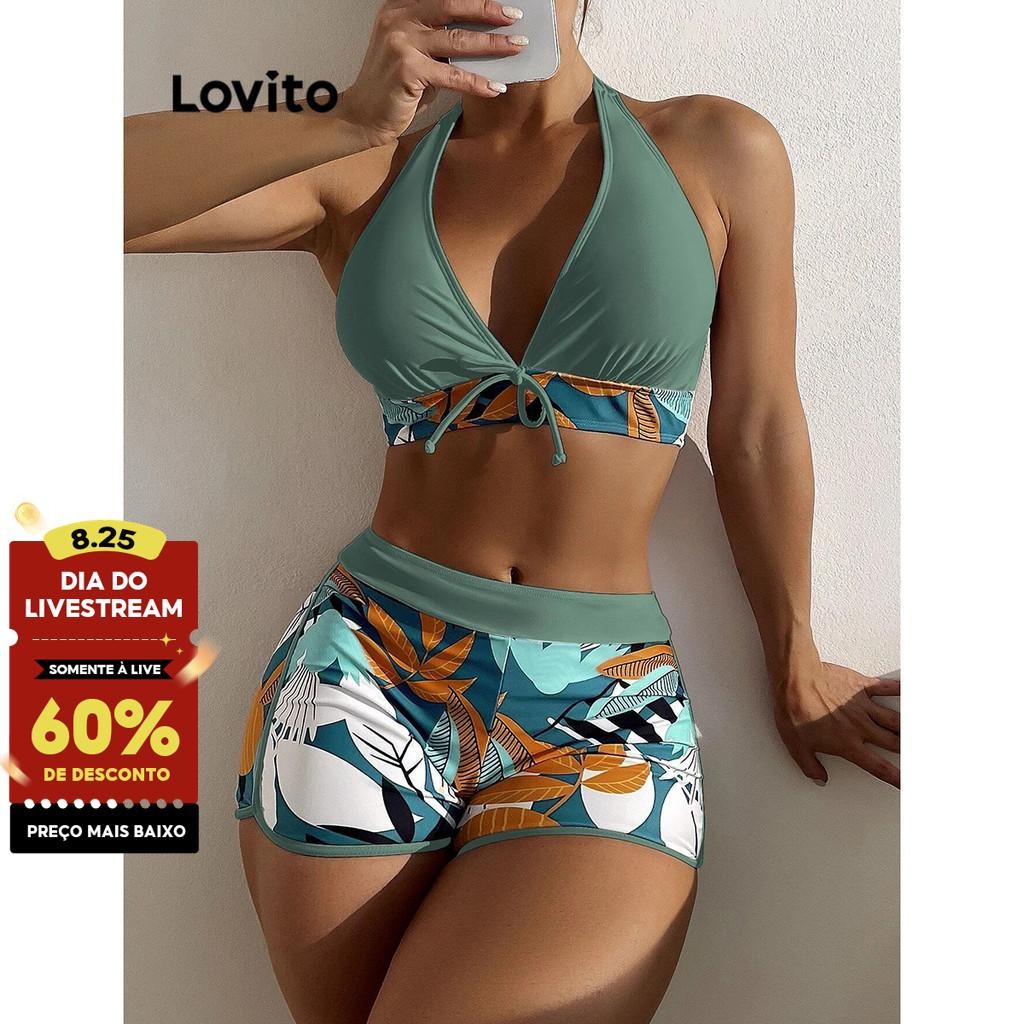 (KOL‘s pick) Lovito Sexy Conjunto Feminino Biquíni com Laço Estampa de Plantas LNL36108 (Branco/Verde/Preto)