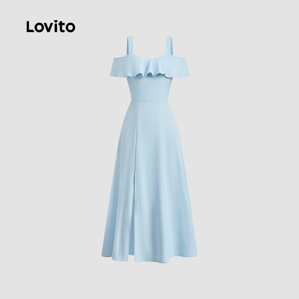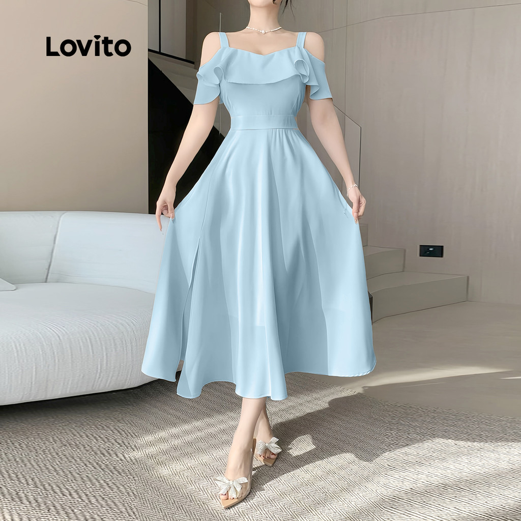 Lovito Vestido Elegante, Liso, Com Babados, Ombro Vazado, Verão/primavera, Para Mulheres L132ED076