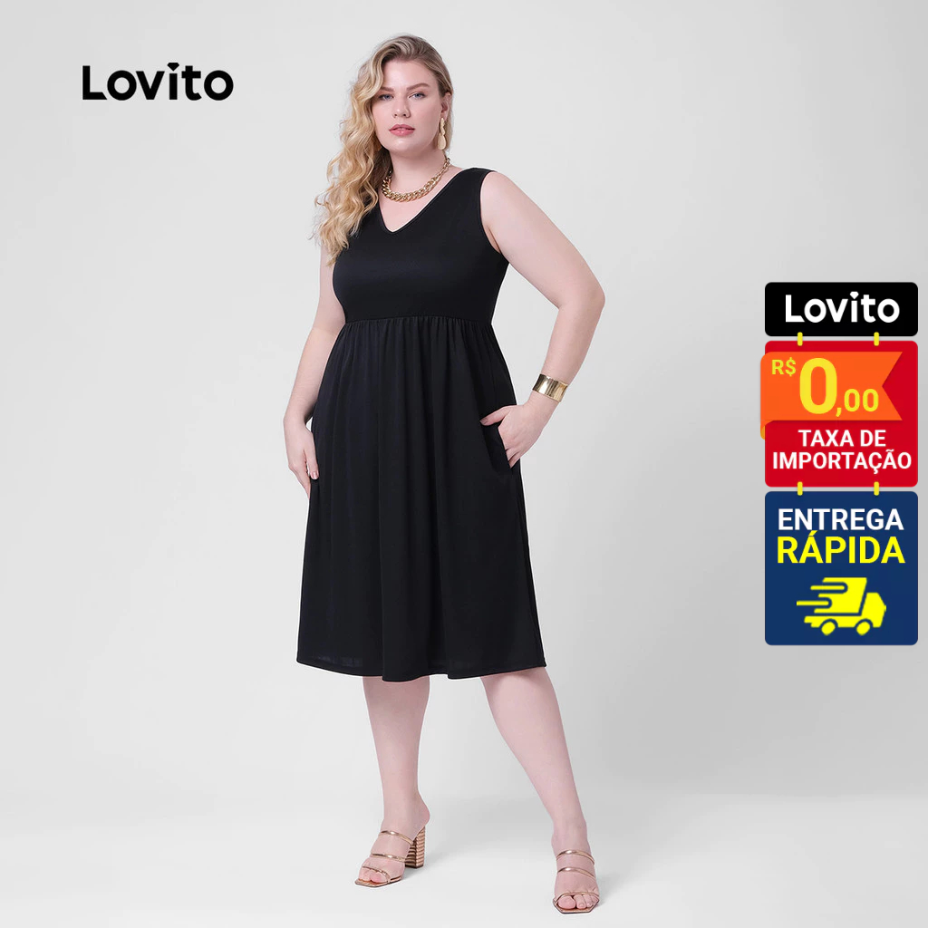 Lovito Vestido Plus Size Curto Decote V Com Bolsos Laterais Basico Feminino LB288BRL317