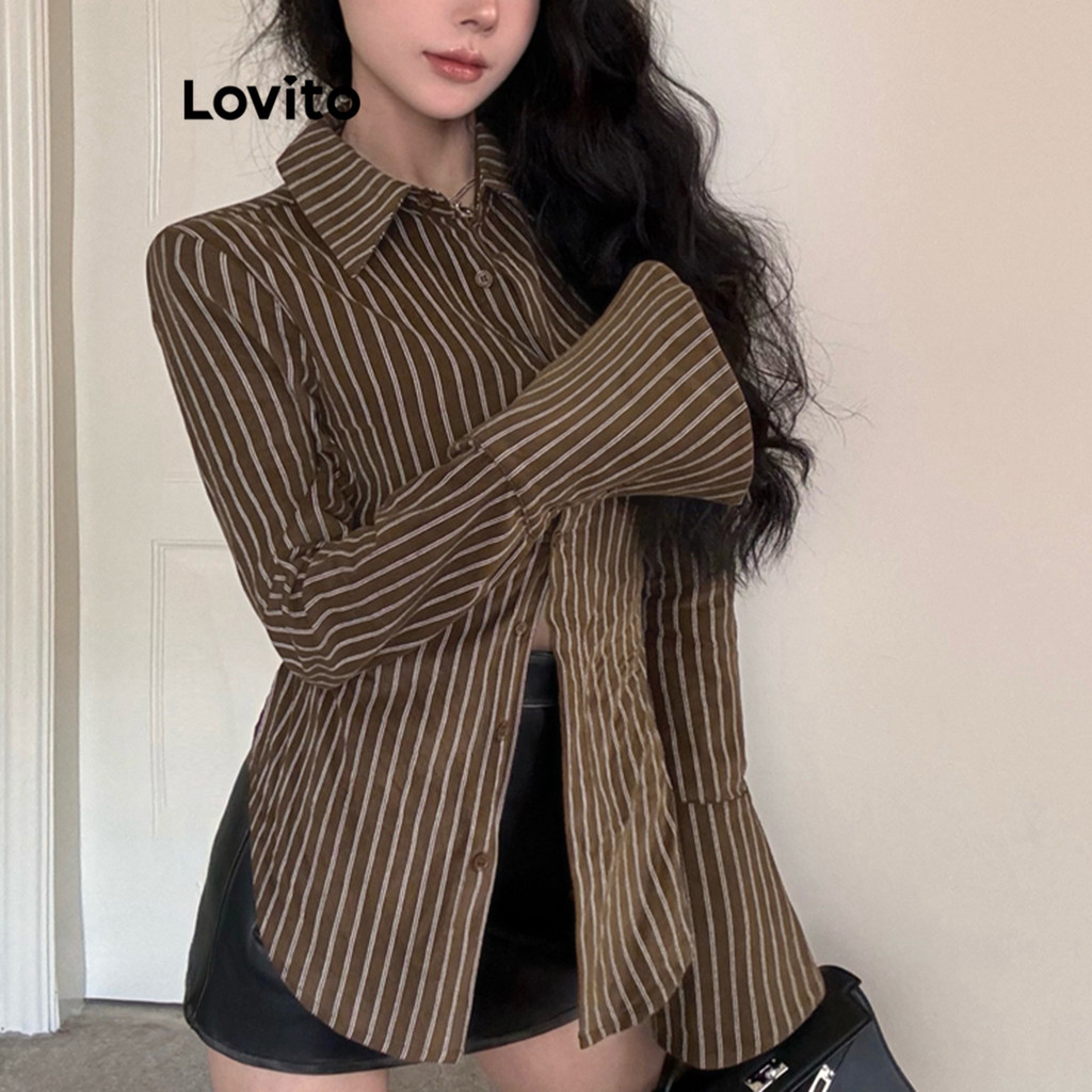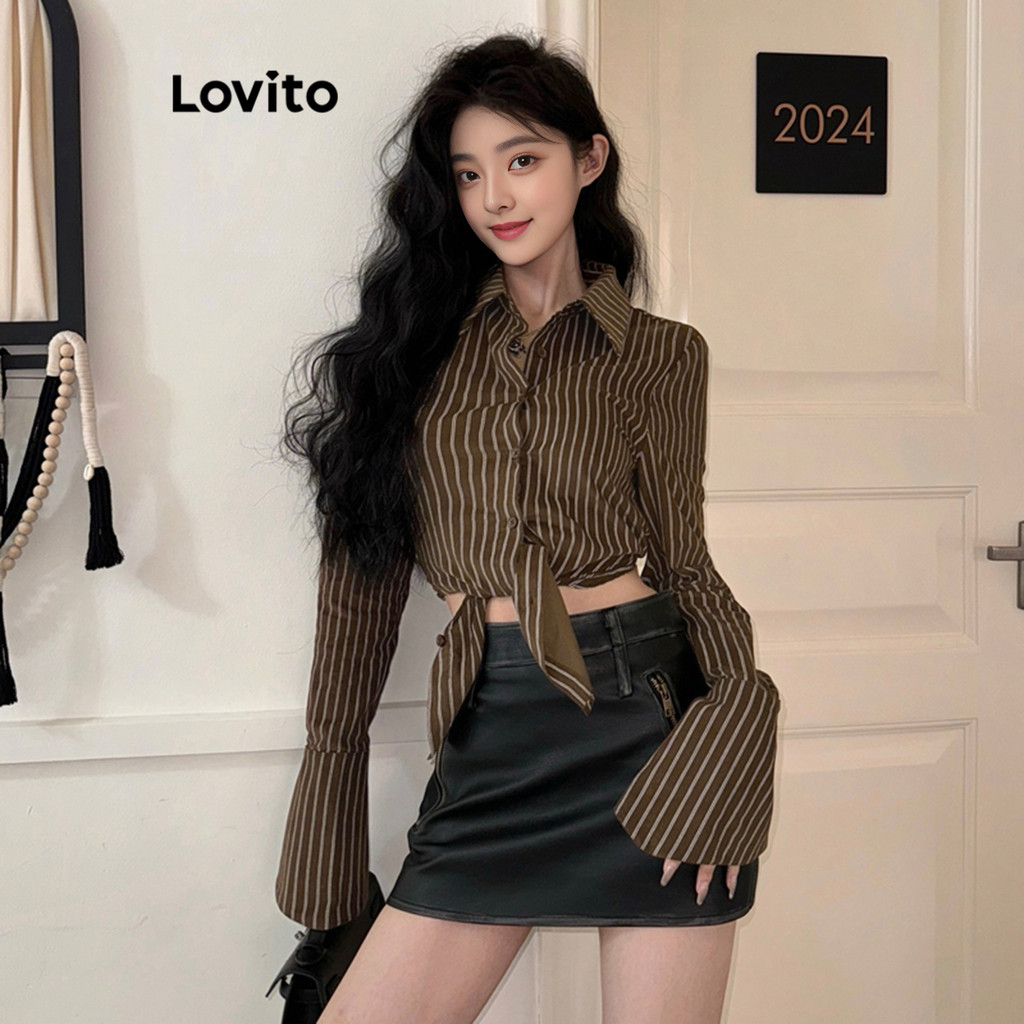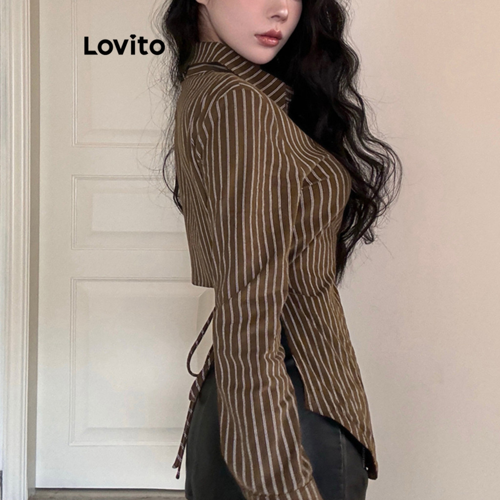 Lovito Blusa Casual Listrada Com Amarração Nas Costas E Manga Trompete Para Mulheres L106AD1249