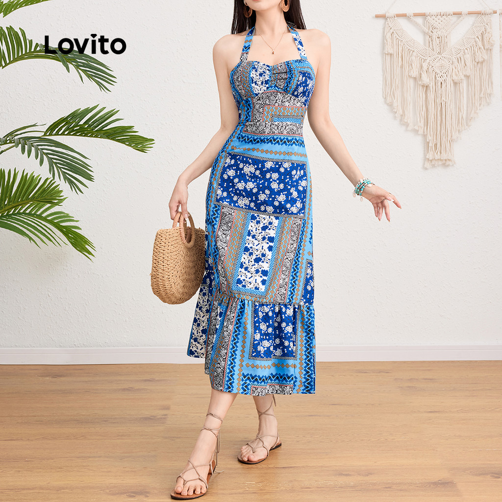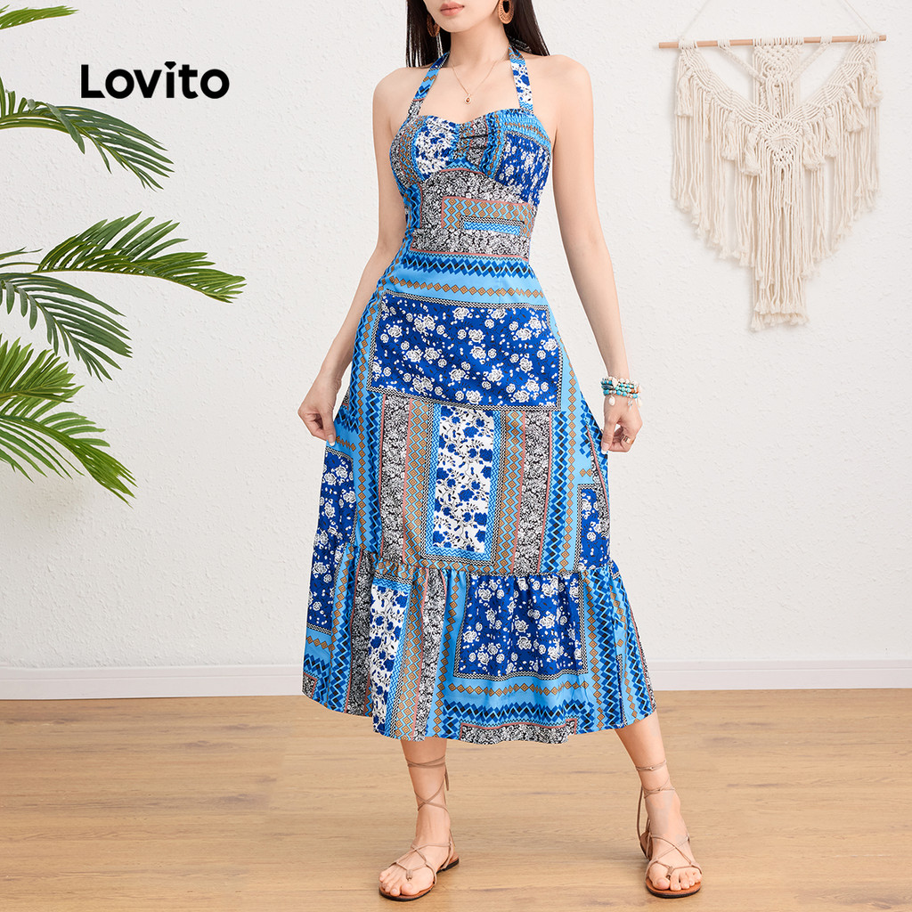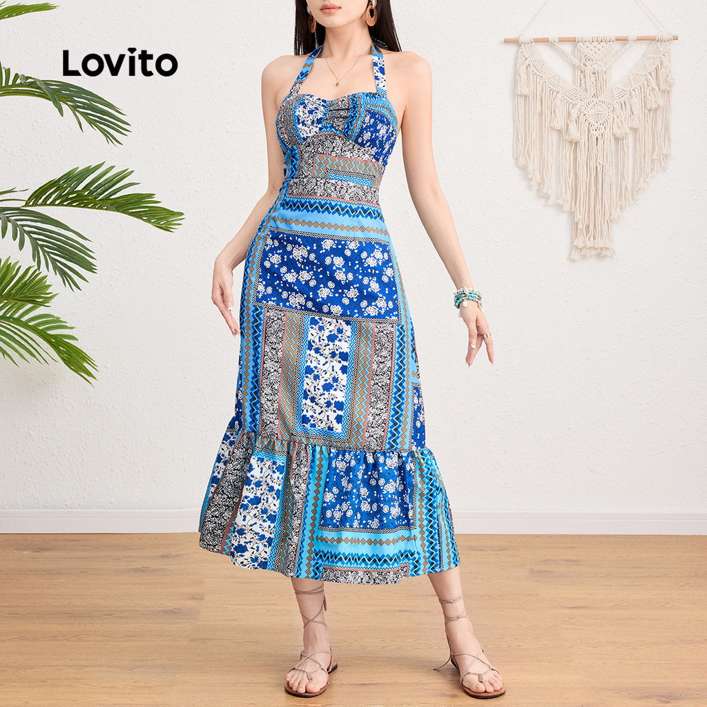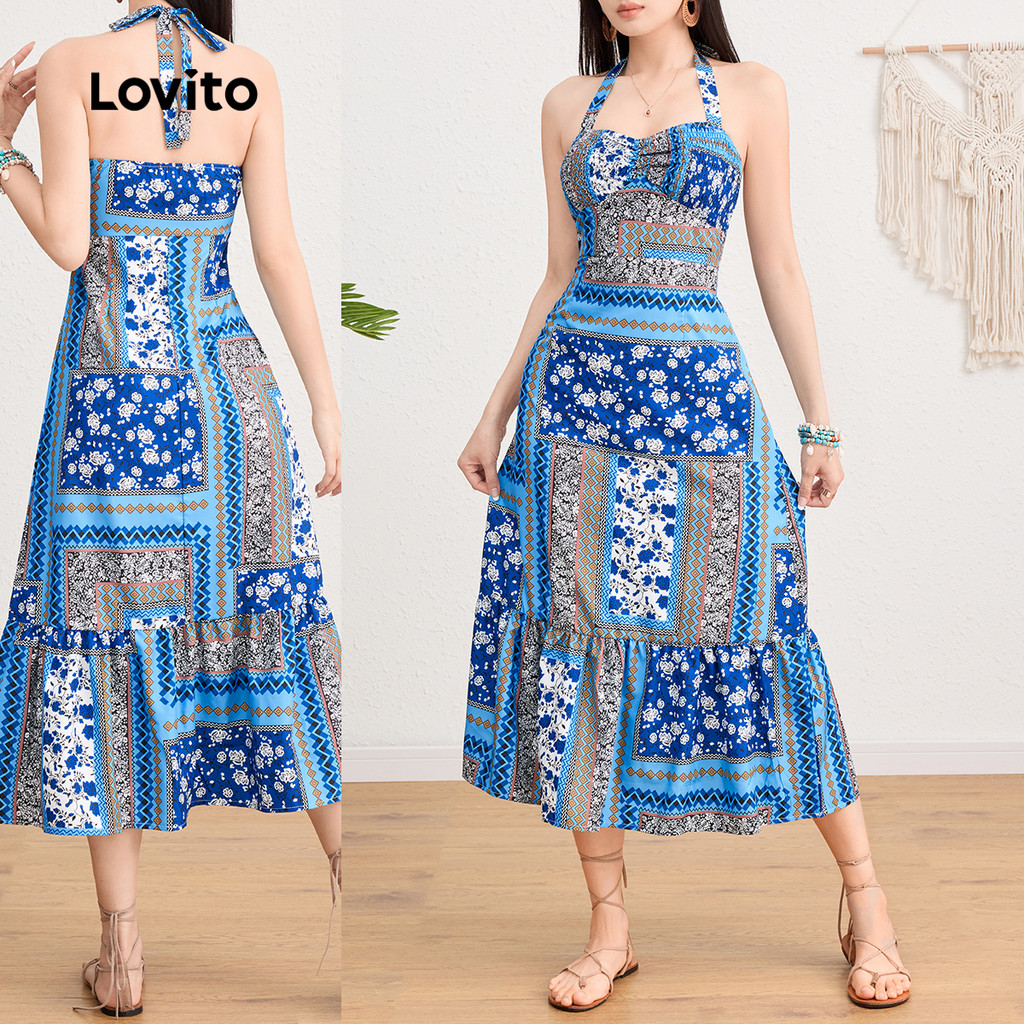 Lovito Vestido Boho Com Estampa Tribal E Detalhe Franzido Com Amarração Nas Costas Férias De Verão/primavera L124AD190