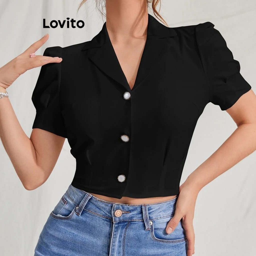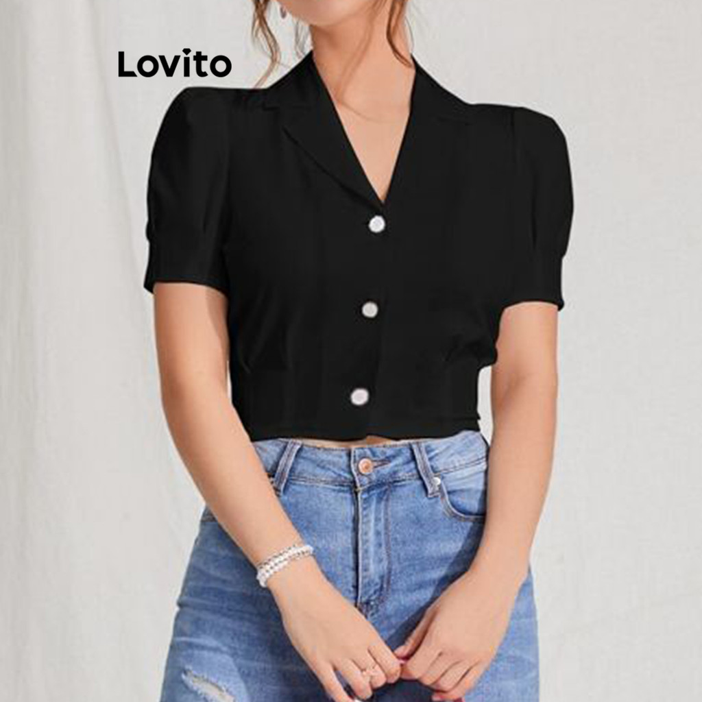 Lovito Blusa Casual Com Botão Liso Plissado Em Tecido Texturizado Para Mulheres L117AD047