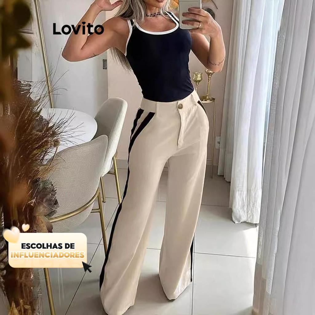 (KOL‘s pick) Lovito Conjuntos elegantes de calças com encadernação em contraste simples para mulheres LNL67157