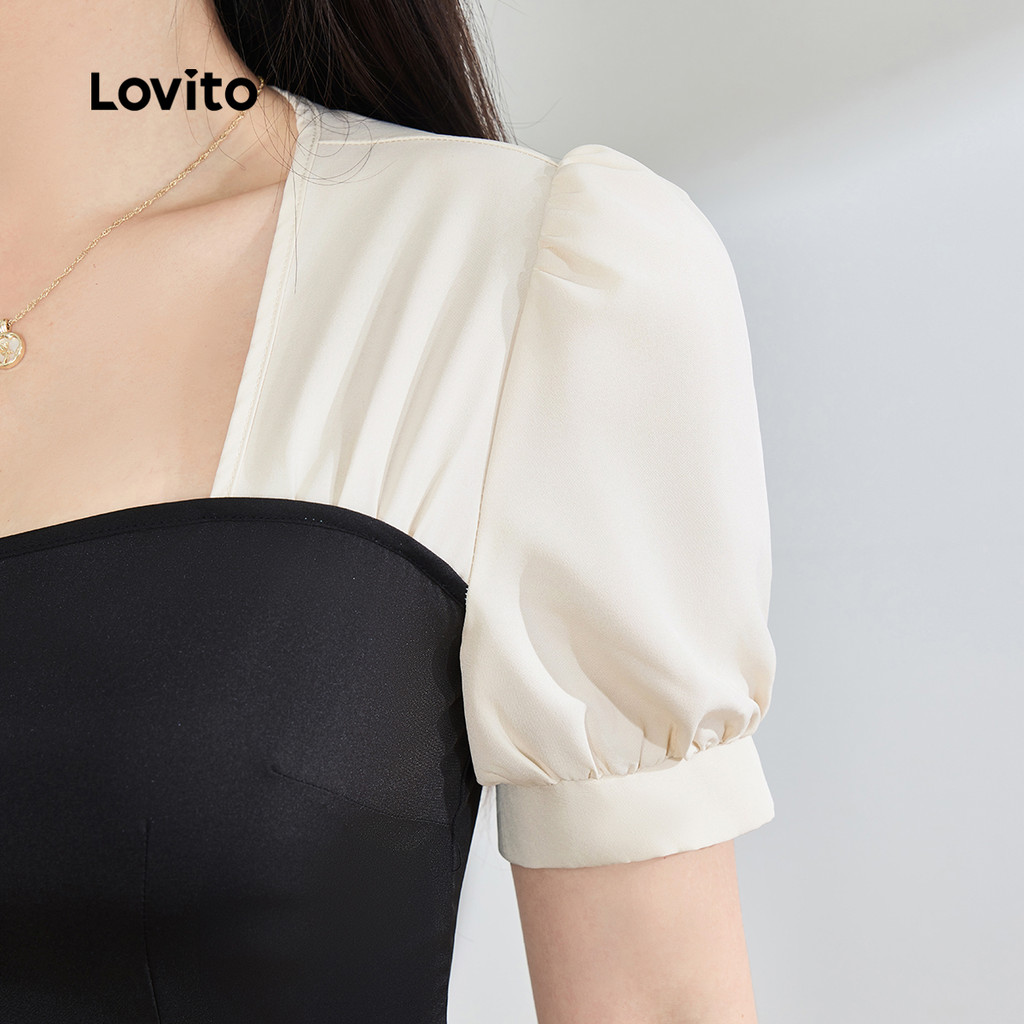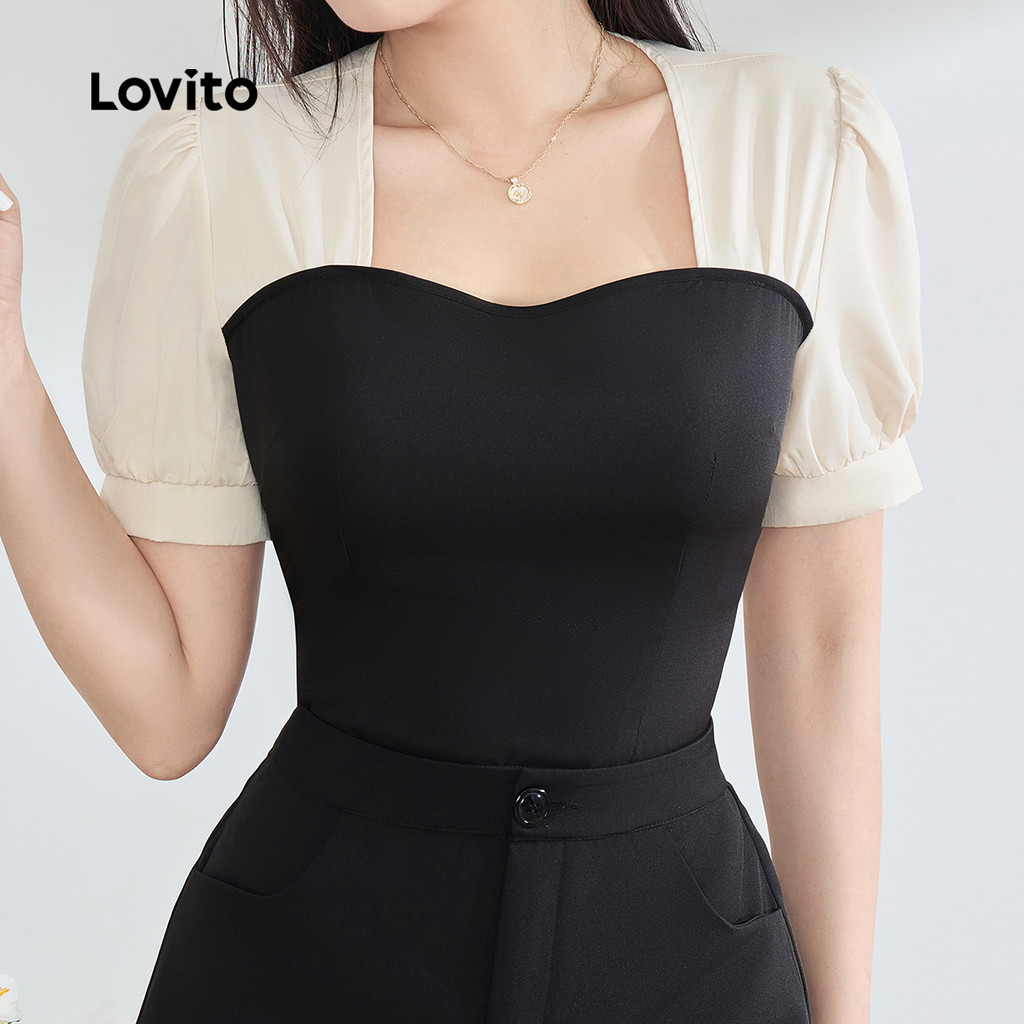 Lovito Elegante Tecido Liso Costura Redonda Primavera/Verão Blusa Preta E Branca Para Mulheres LBL25468