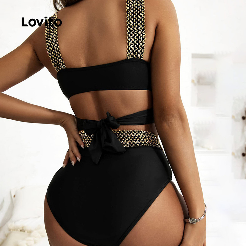 Lovito Conjunto Biquíni Boho Recorte Primavera Verão Preto Feminino LNL126259