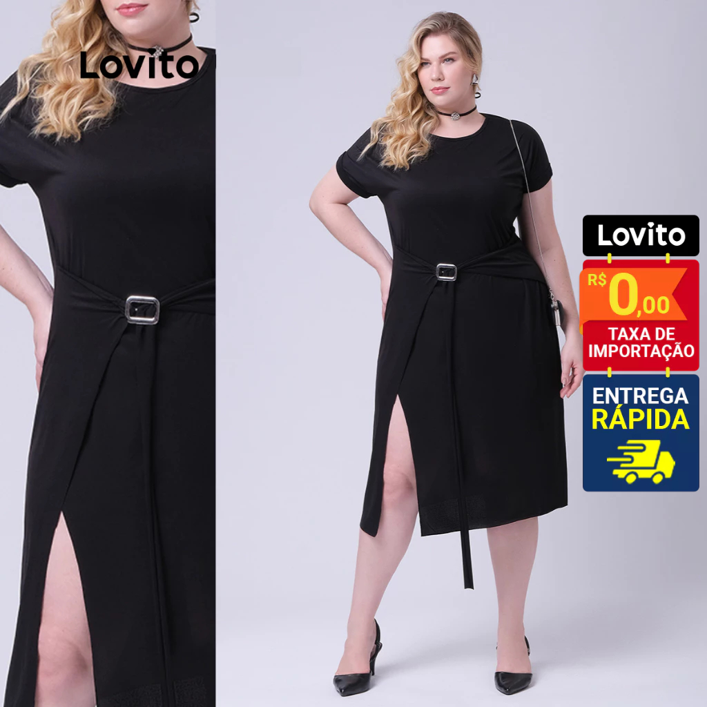 Lovito Vestido Plus Size Manga Curta Midi com Fivela Basico Feminino LB292BRL321