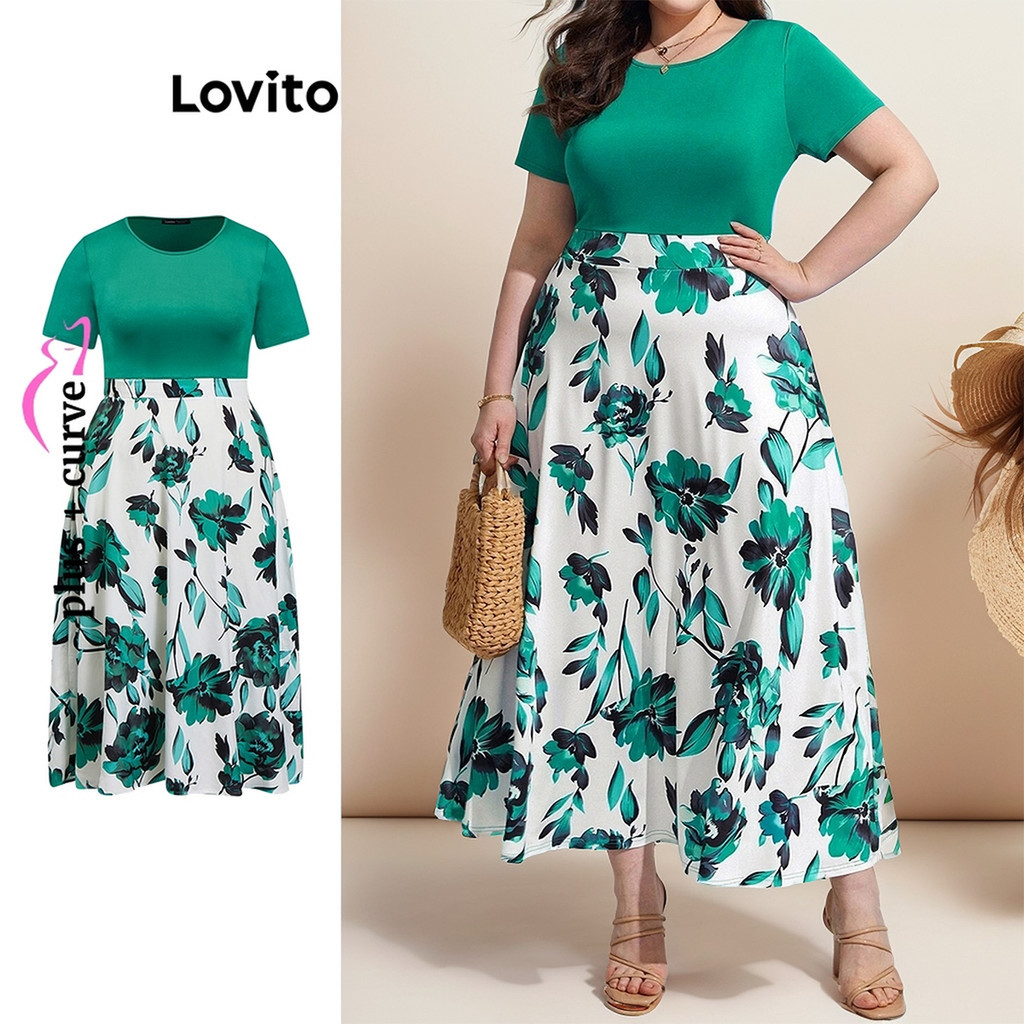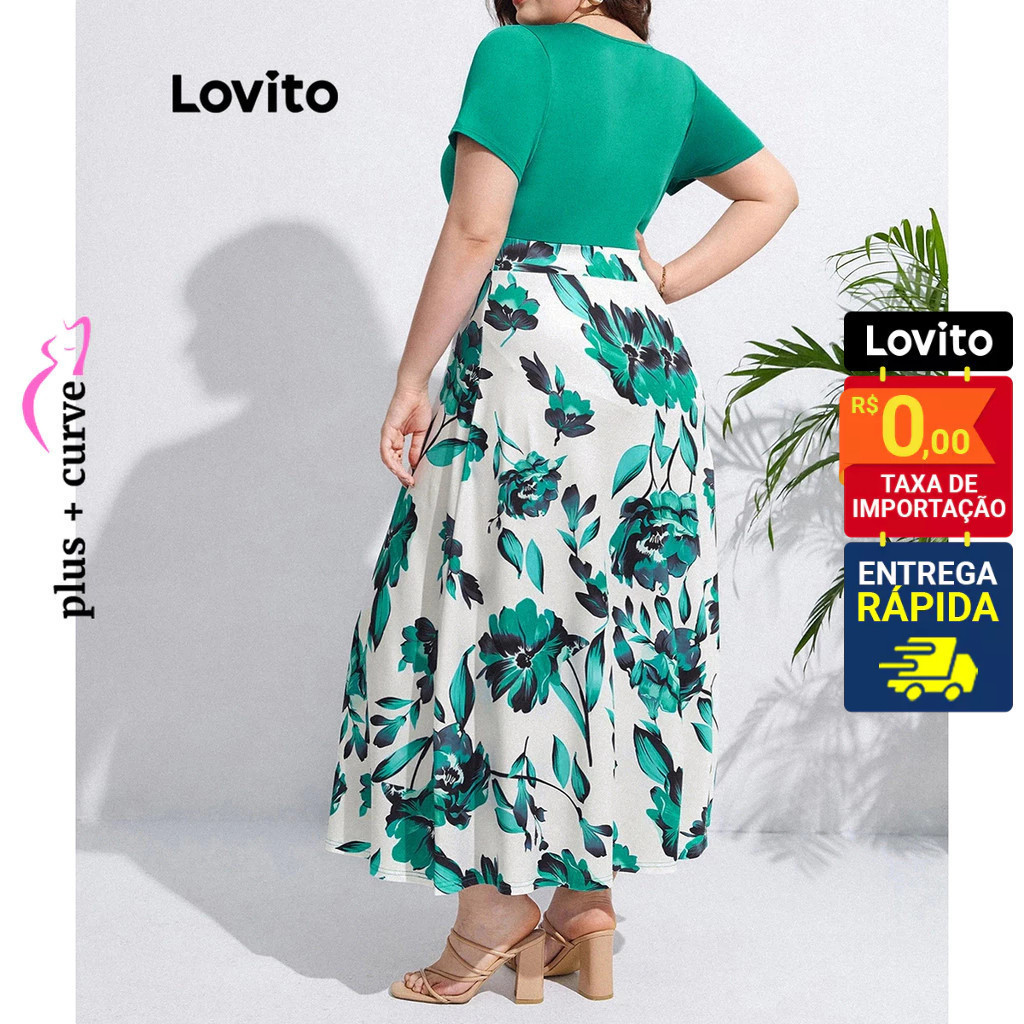 Lovito Vestido Feminino Midi Cores Contrastantes Floral Plus Size LBL09426