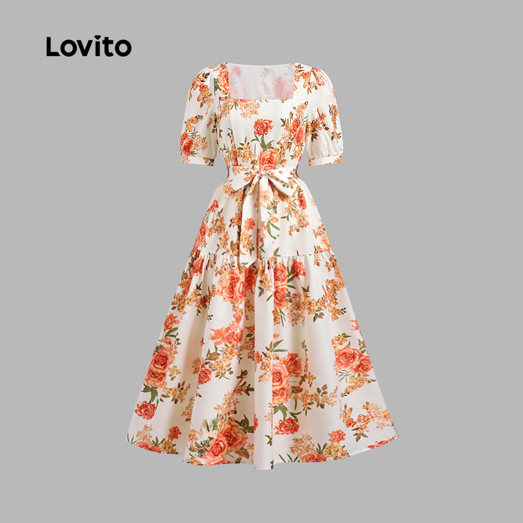 (Trendy) Lovito Vestido Casual Floral em camadas com cinto para mulheres LBL24080