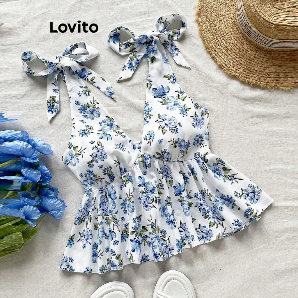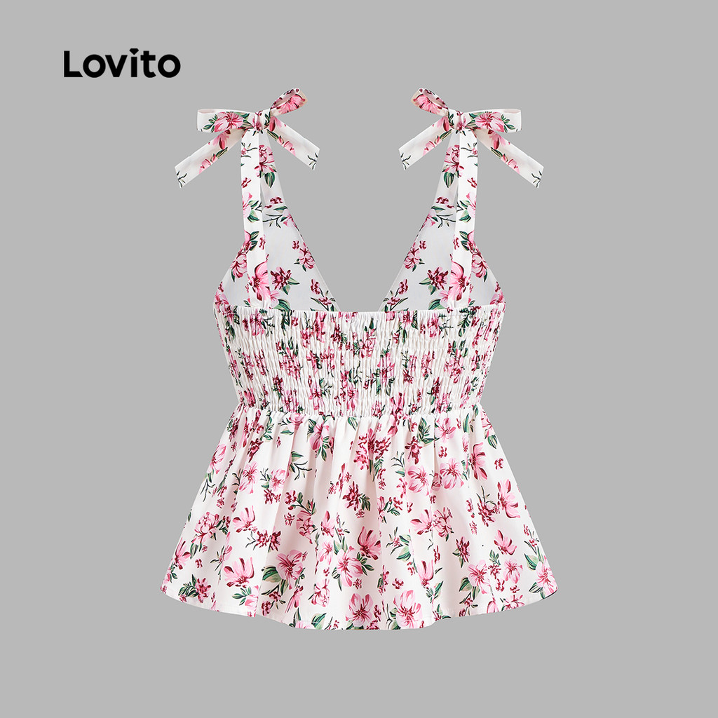 Lovito Boho Top Ditsy Floral Lace Up Regata De Verão Para Mulheres L99ED686