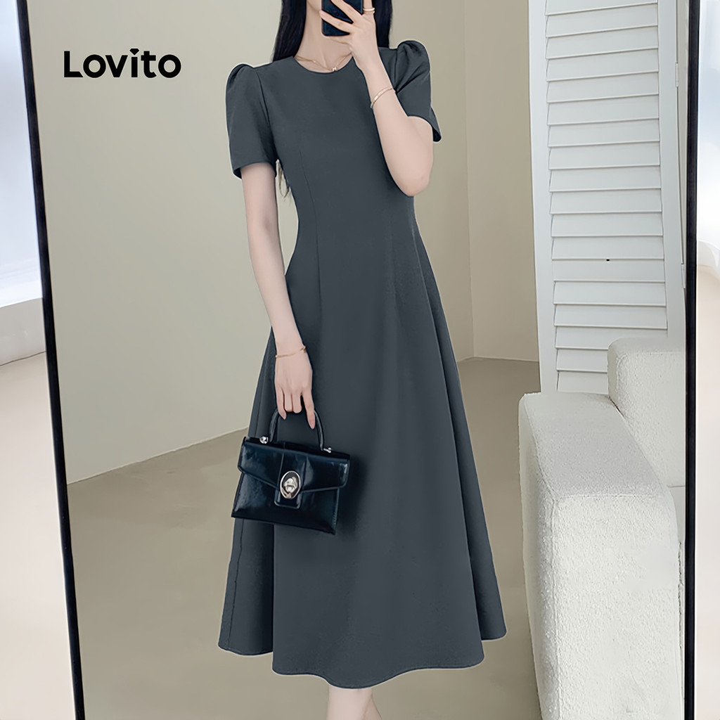 (New) Lovito Vestido Elegante Drapeado de Textura para Transporte Vestido Cinza Primavera/verão para mulheres L144AD090