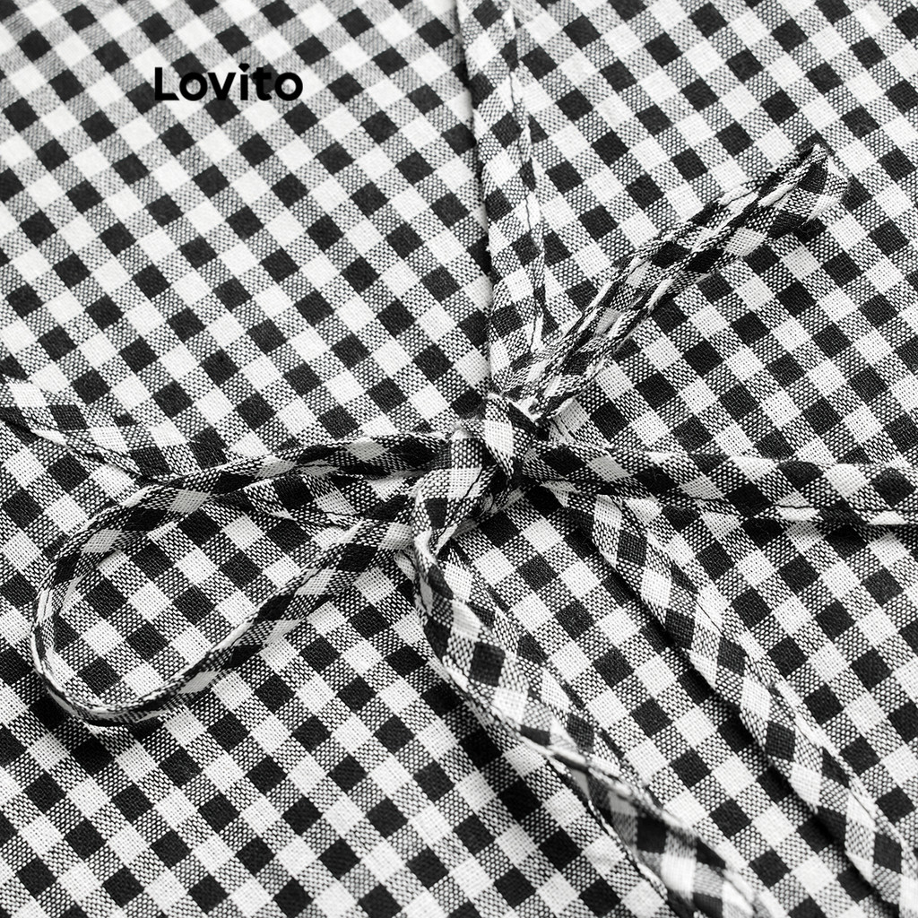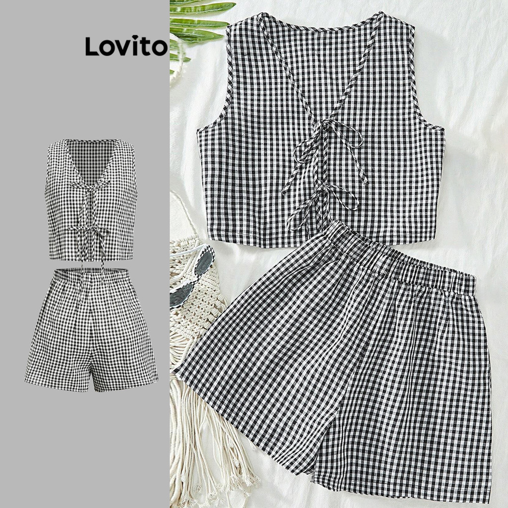 Lovito Conjuntos de shorts casuais xadrez com cadarço para mulheres L108ED370