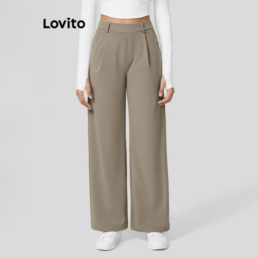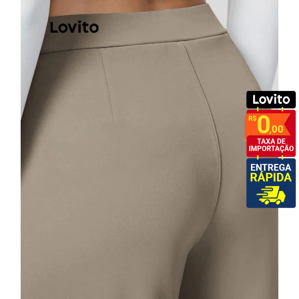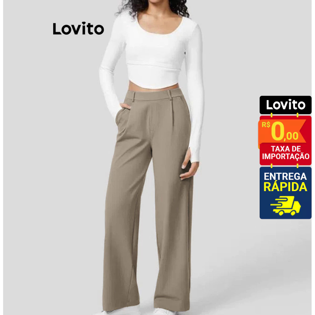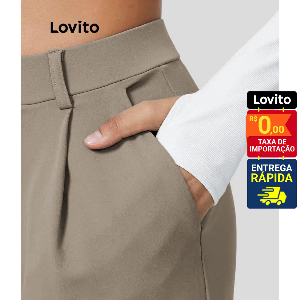 Lovito Calça Feminina Reta com Pregas e Bolso Lateral LNL58245