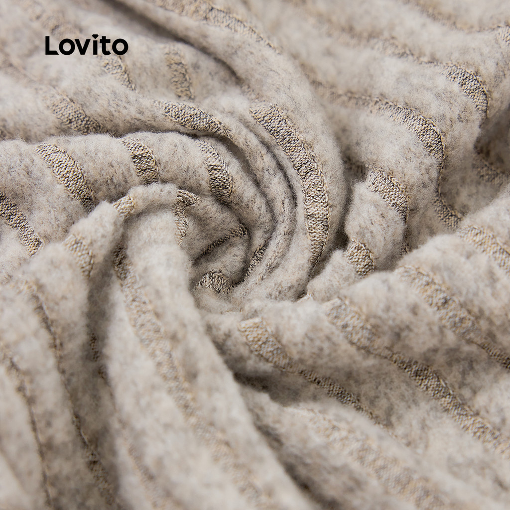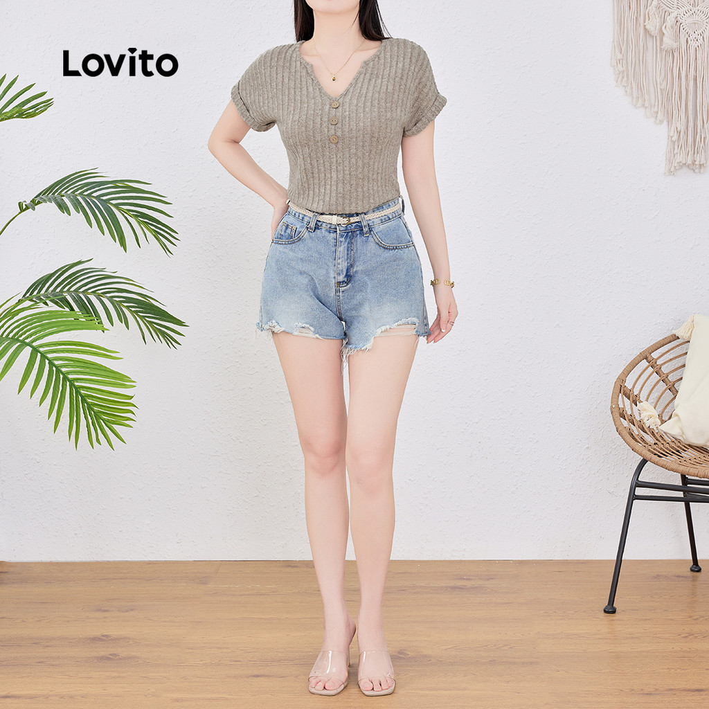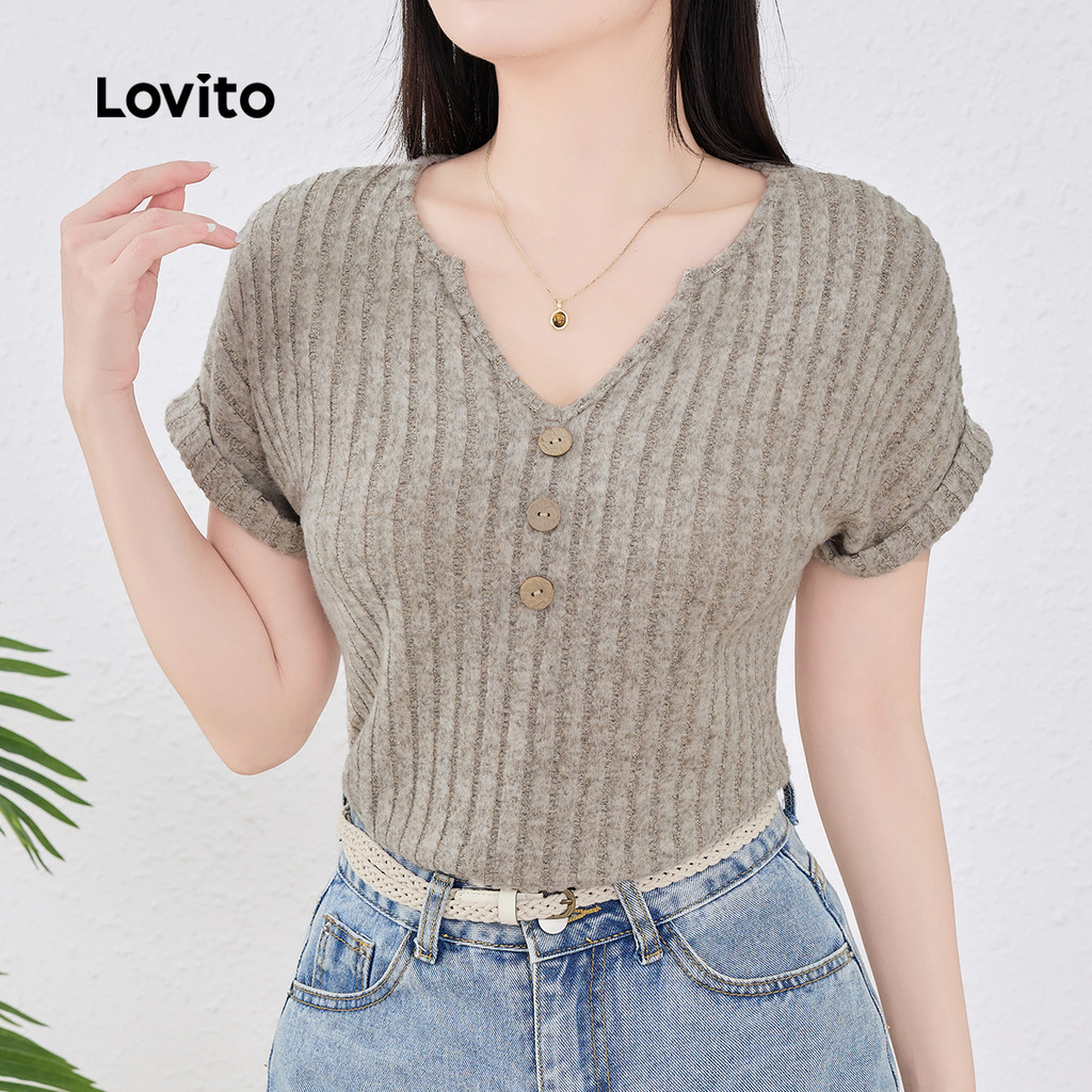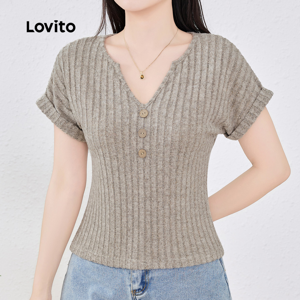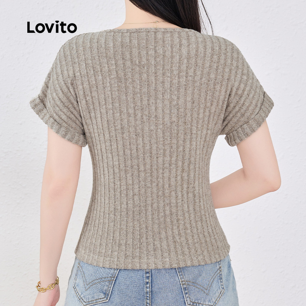 (New) Lovito Camisa Casual de Malha com Gola em Ribana para Primavera/verão para mulheres L143ED424