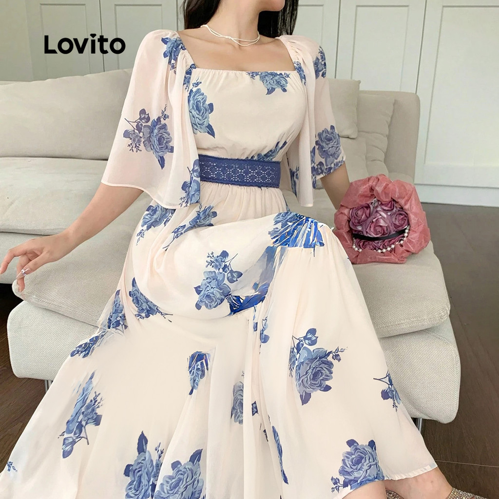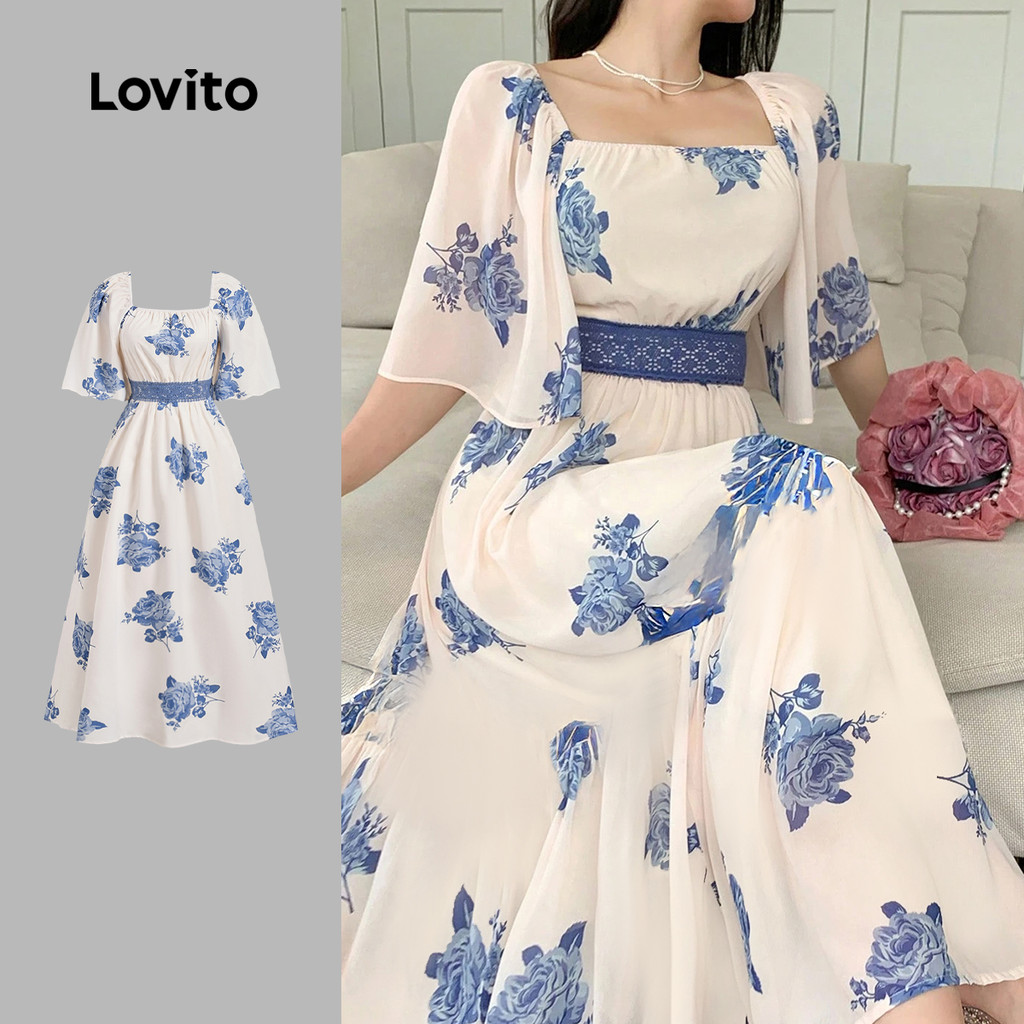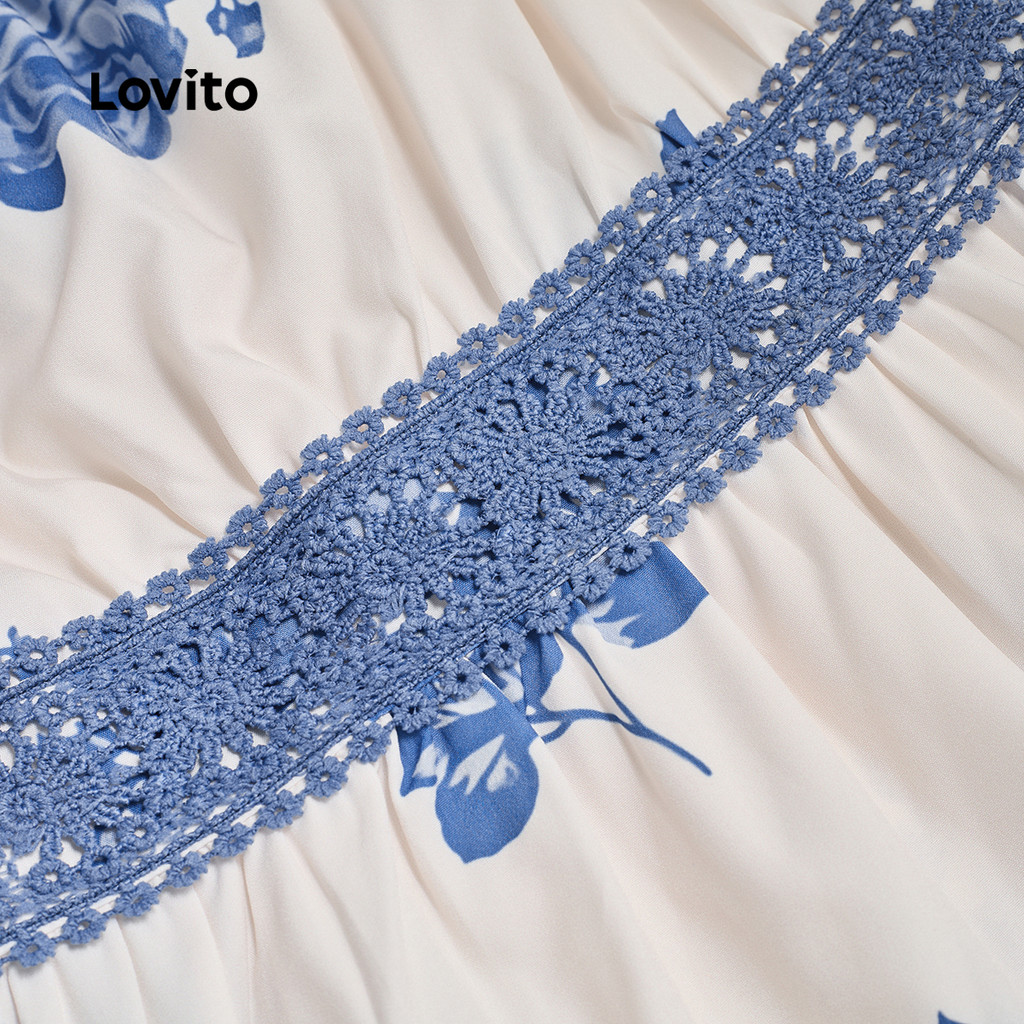 Lovito Vestido Boho de Renda com Bloco de Cores Primavera/verão Vestido Azul e Branco para mulheres LBL27028