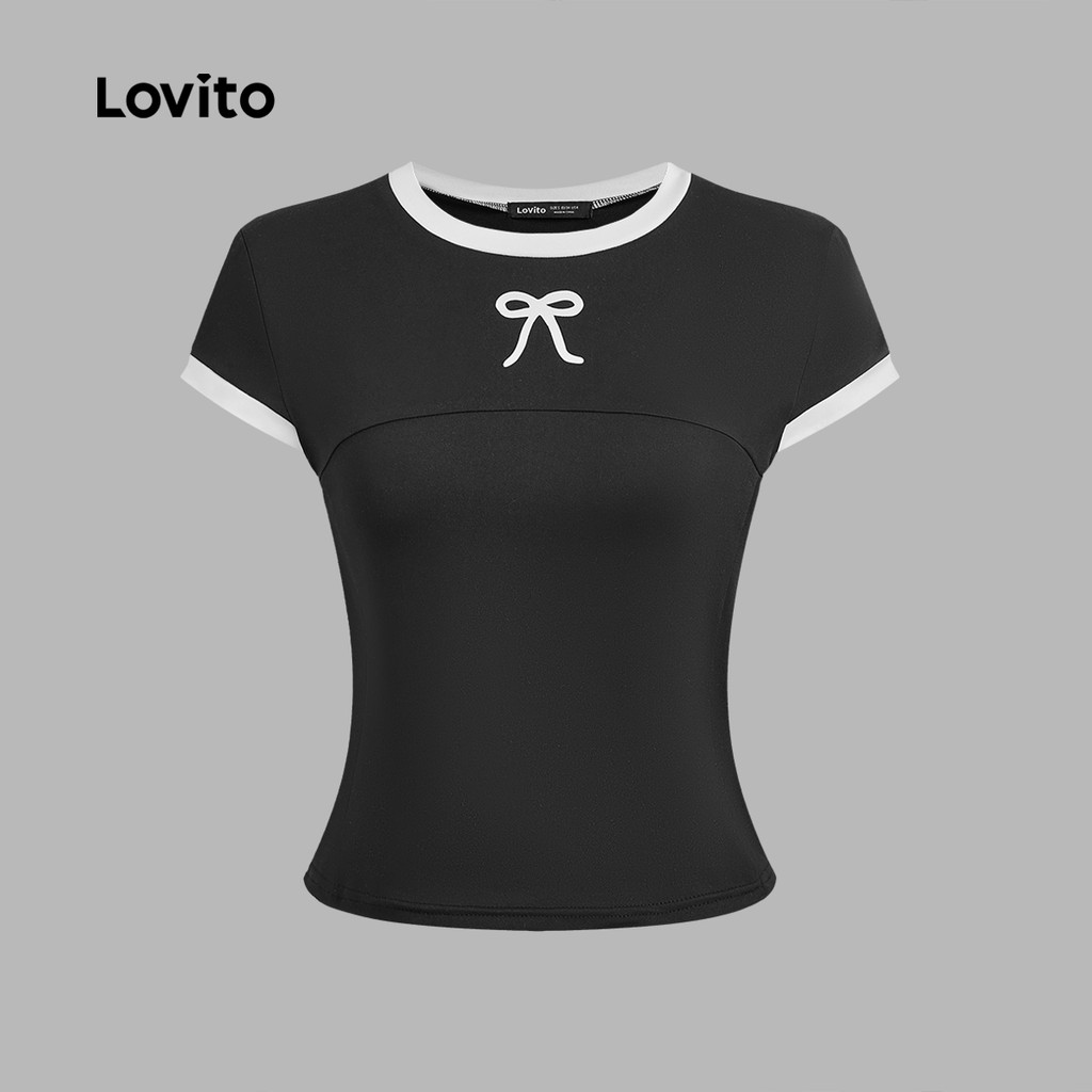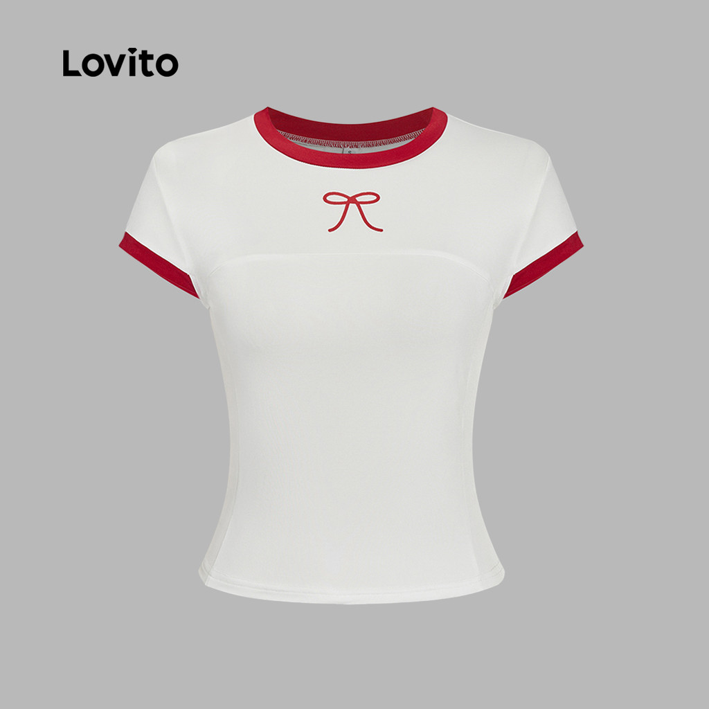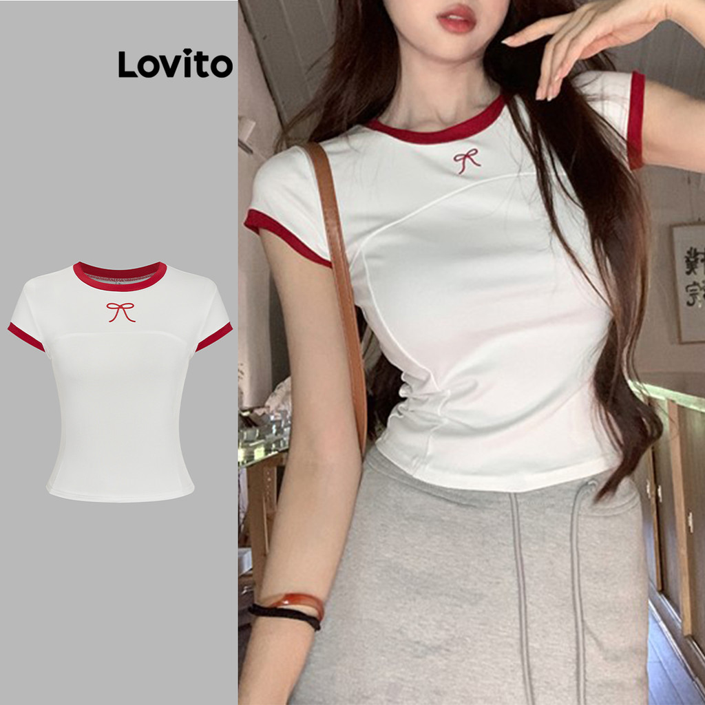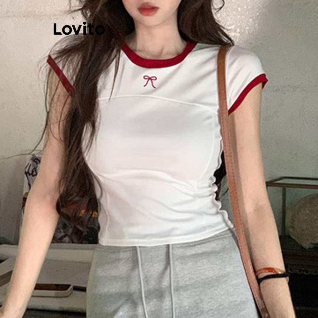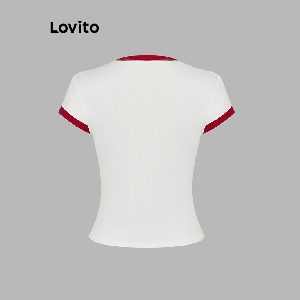 Lovito Camiseta Casual Simples Contraste Encadernação Tecido Costura Padrão Camiseta Para Mulheres L100MD129