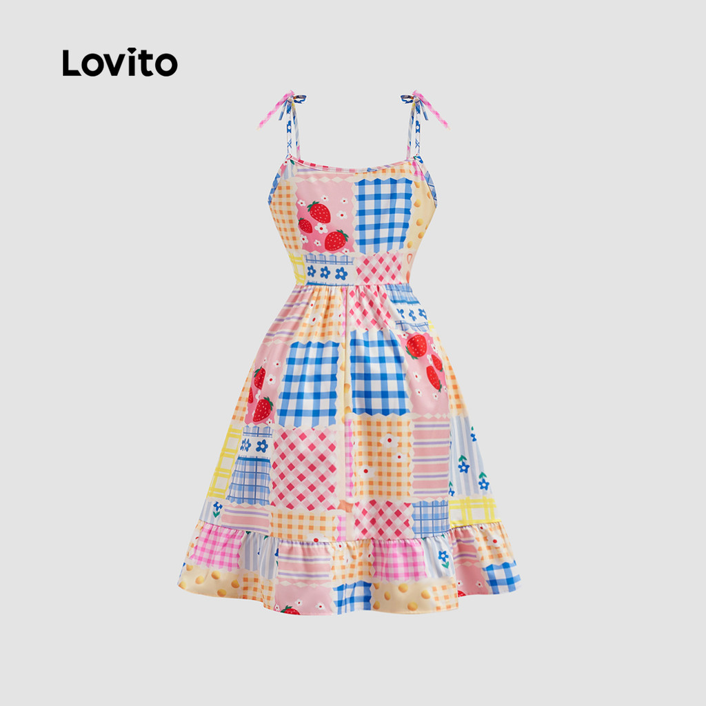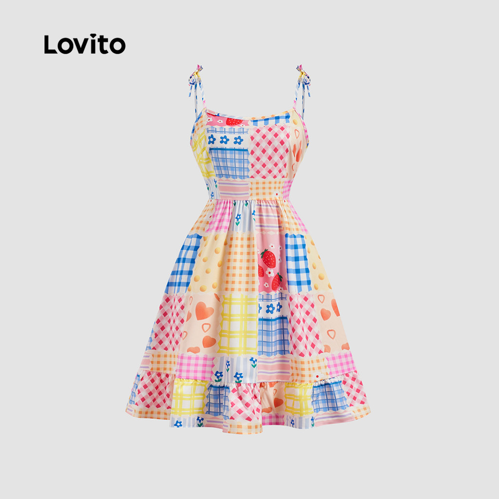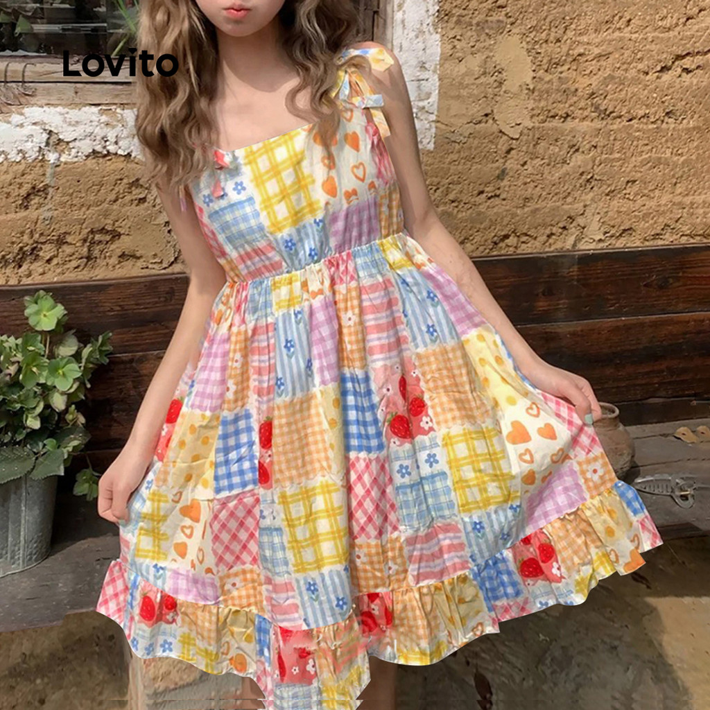 Lovito Vestido Boho Geométrico Ruffle Hem Lace Up Dopamina Vestido De Verão/Primavera Para Mulheres L129ED039