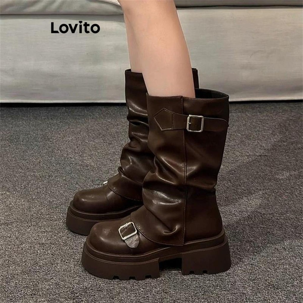 Lovito Vintage Plain Brown Maillard Retro Martin Botas Sola Grossa Elevação Versátil Moda Bota para Mulheres LFA56412