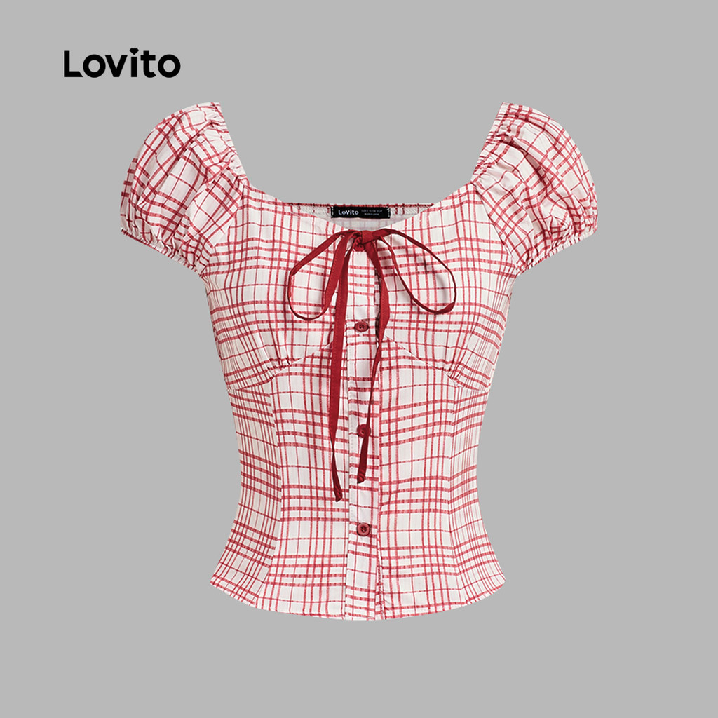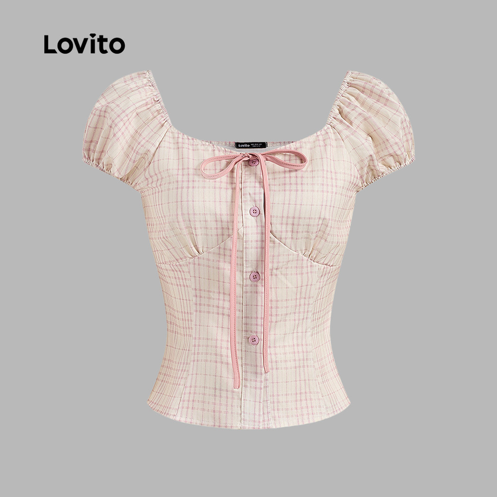Lovito Blusa Rosa Xadrez Vichy Com Laço Para Look Casual De Primavera/verão Para Mulheres L136AD105