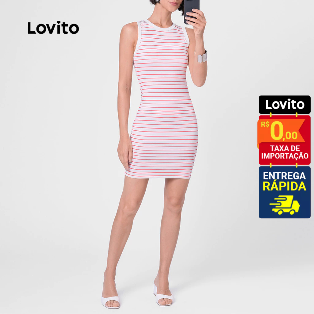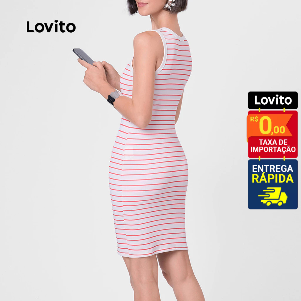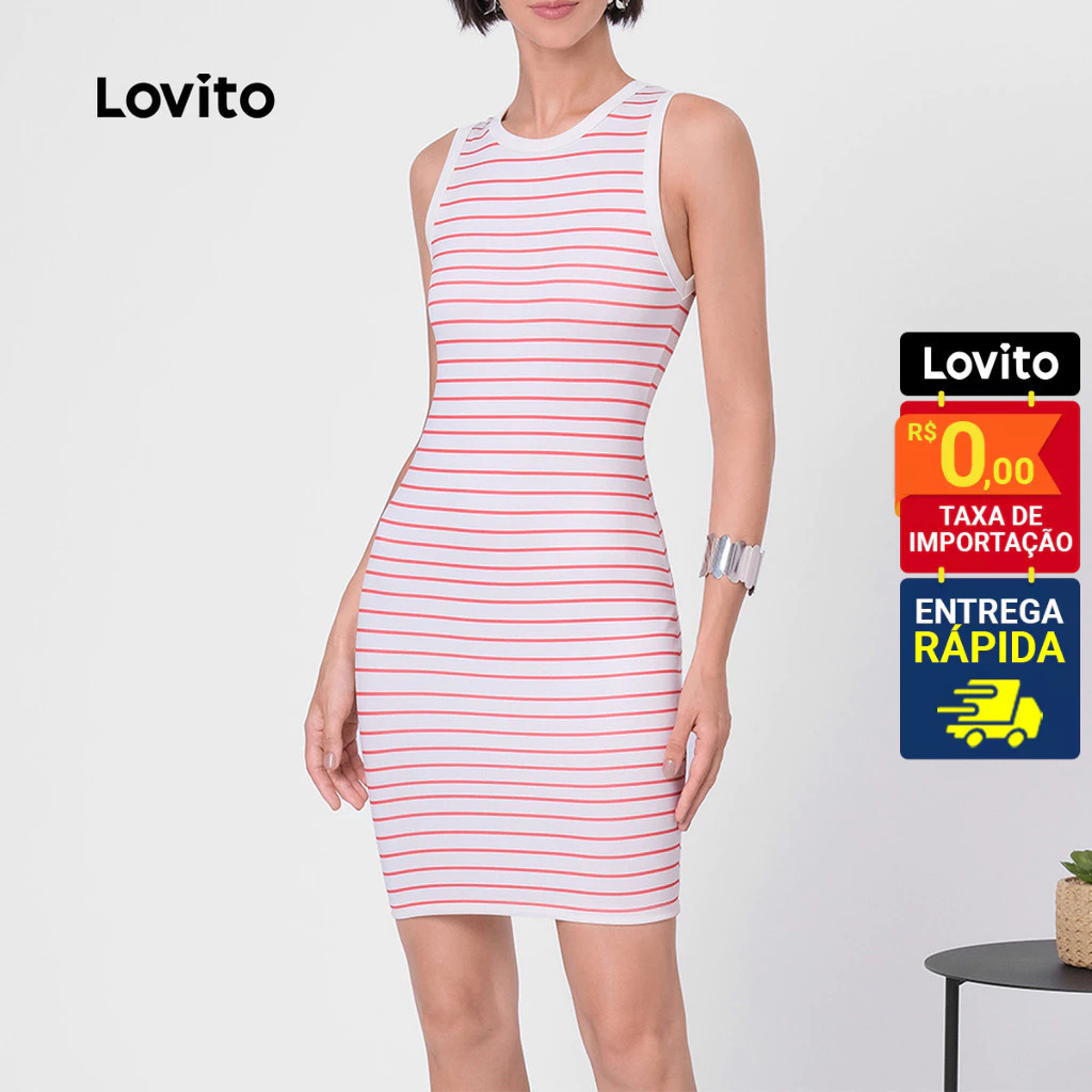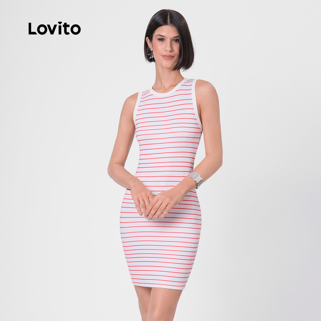 Lovito Vestido Listrado Vermelho Curto Sem Manga Gola Contrastante Feminino LB108BRL137