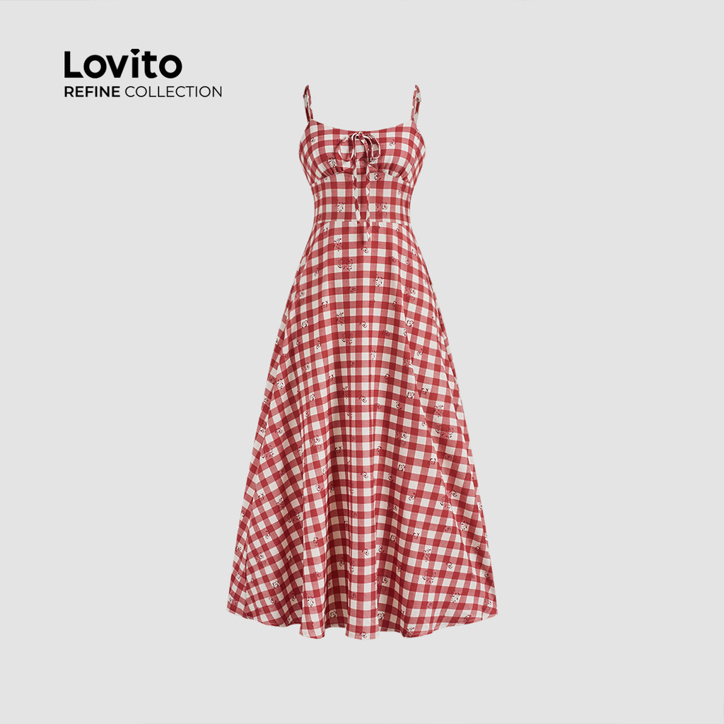 (Lovito Refine) Vestido Xadrez Fofo Com Amarração Frontal E Detalhes Franzidos Para O Verão/primavera Feminino LR2AD007