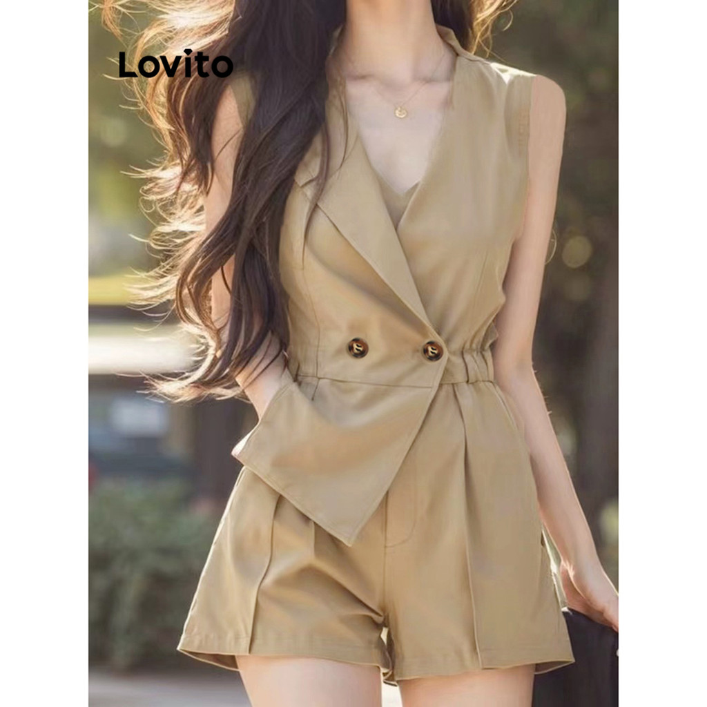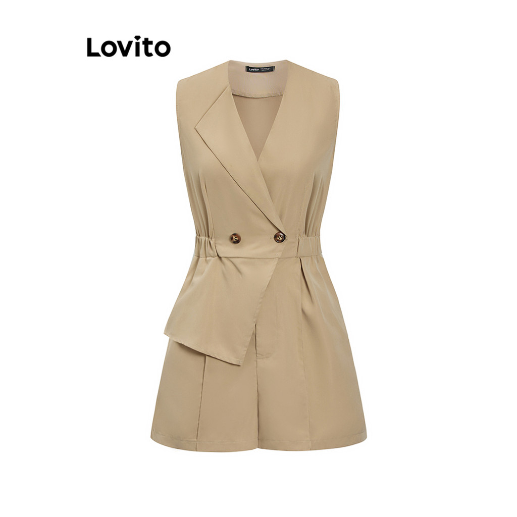 (Trendy) Lovito Elegante Simples Falso 2 Em 1 Botão Macacão para Mulheres L105MD568