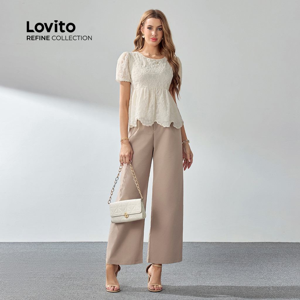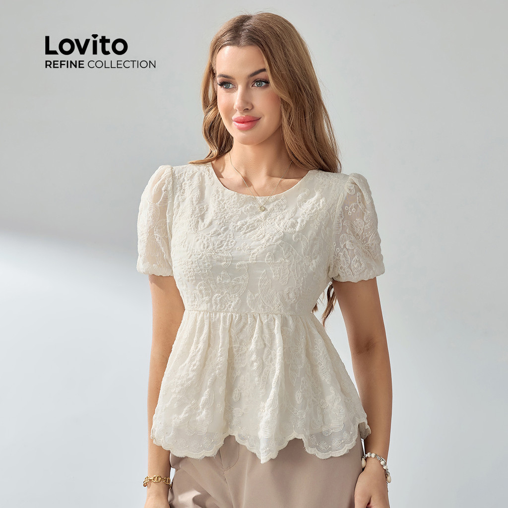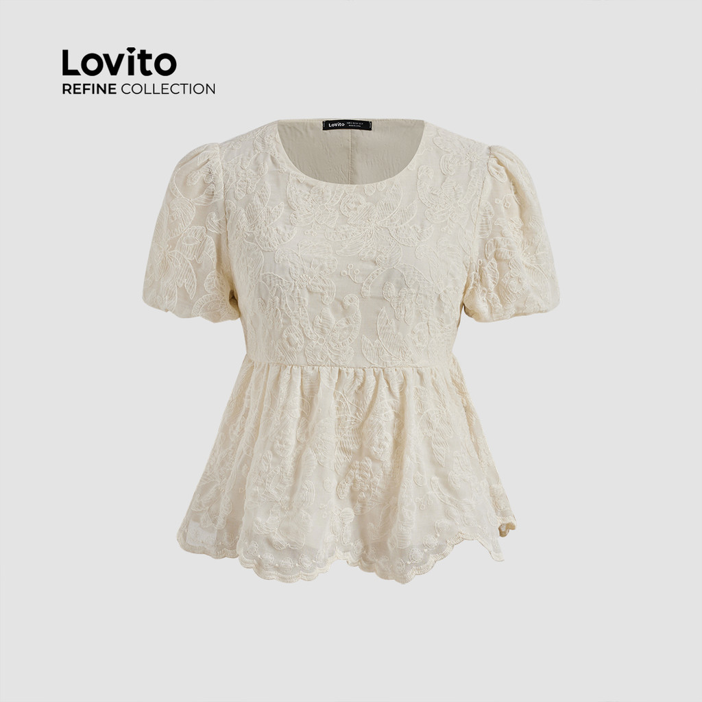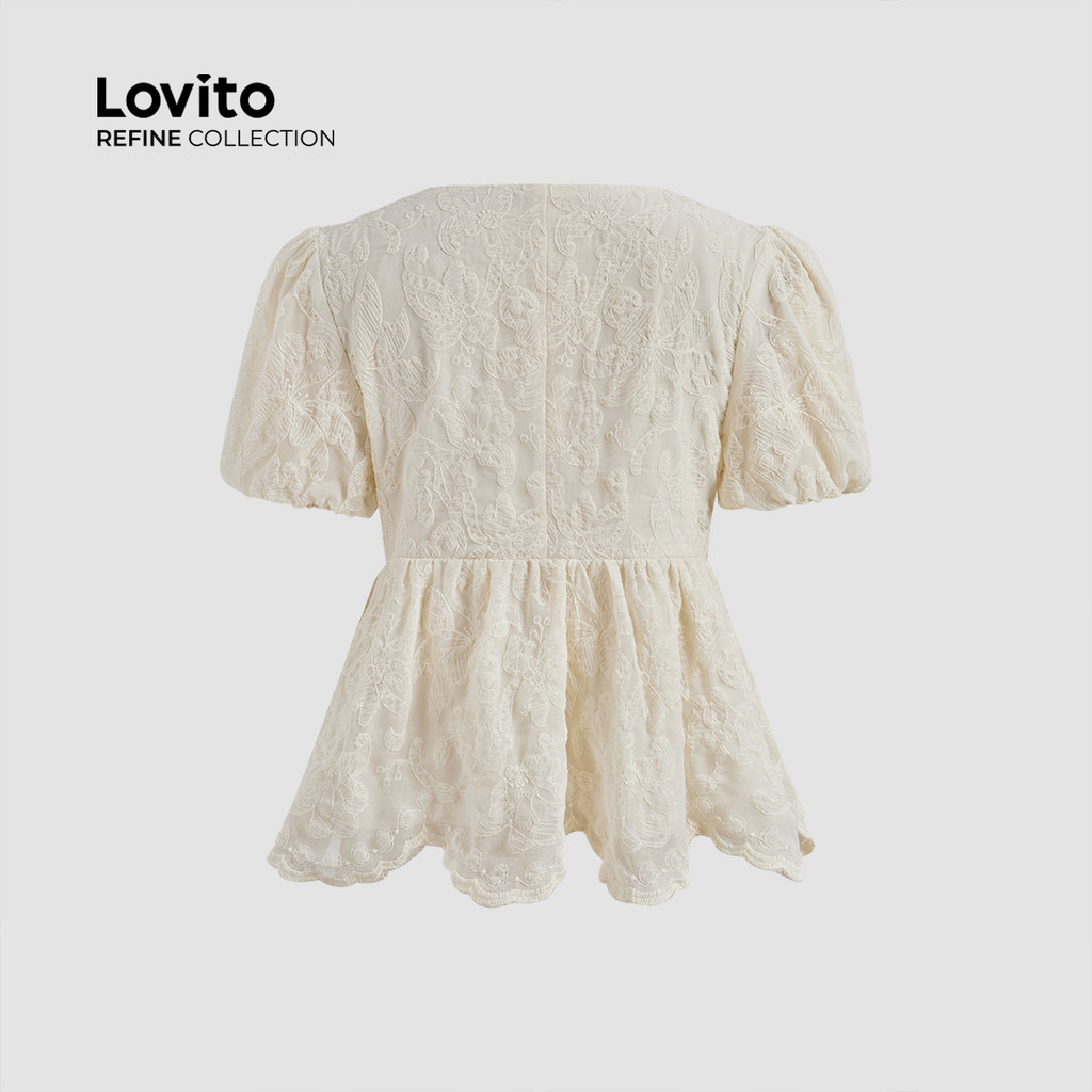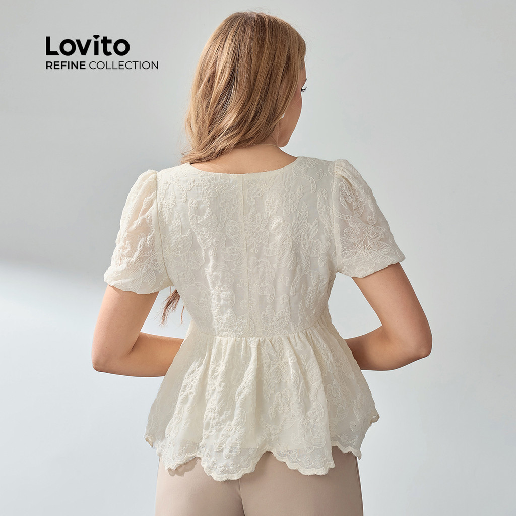(Lovito Refine) Blusa Feminina Elegante Renda Floral Camada Dupla Babados Blusa De Verão/primavera LR2LD082