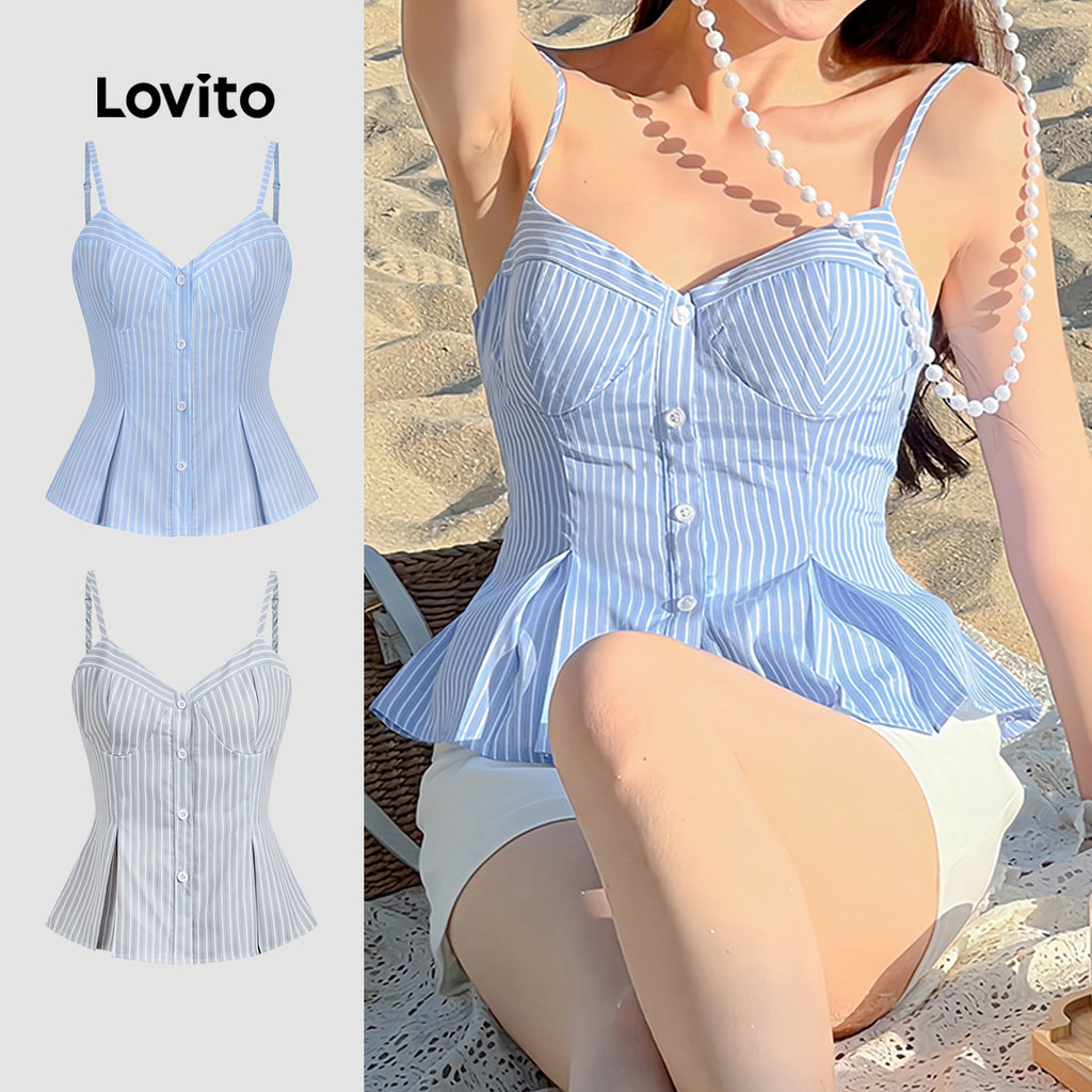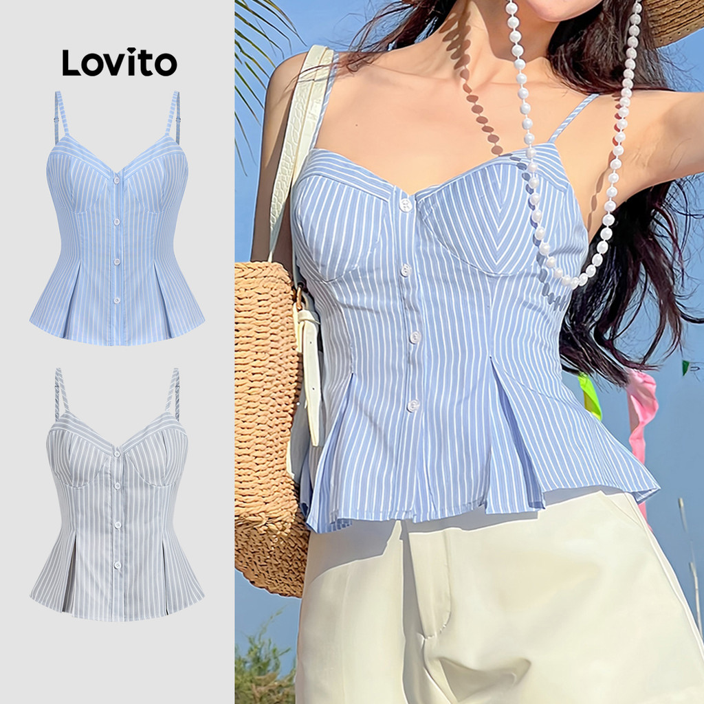 Lovito Blusa Casual de Botões No Topo com Pregas Linha Estrutural Primavera/verão Azul para mulher L144AD031