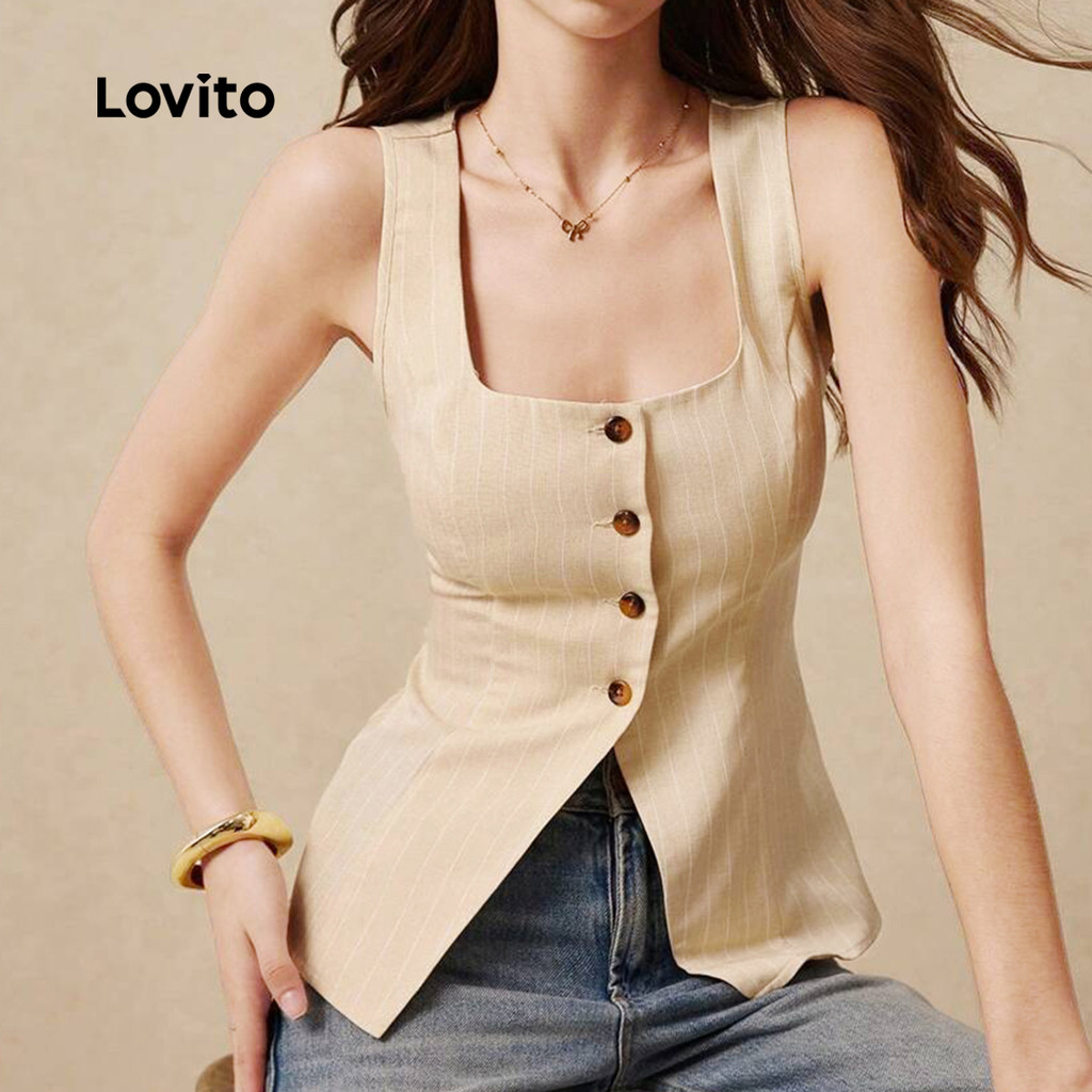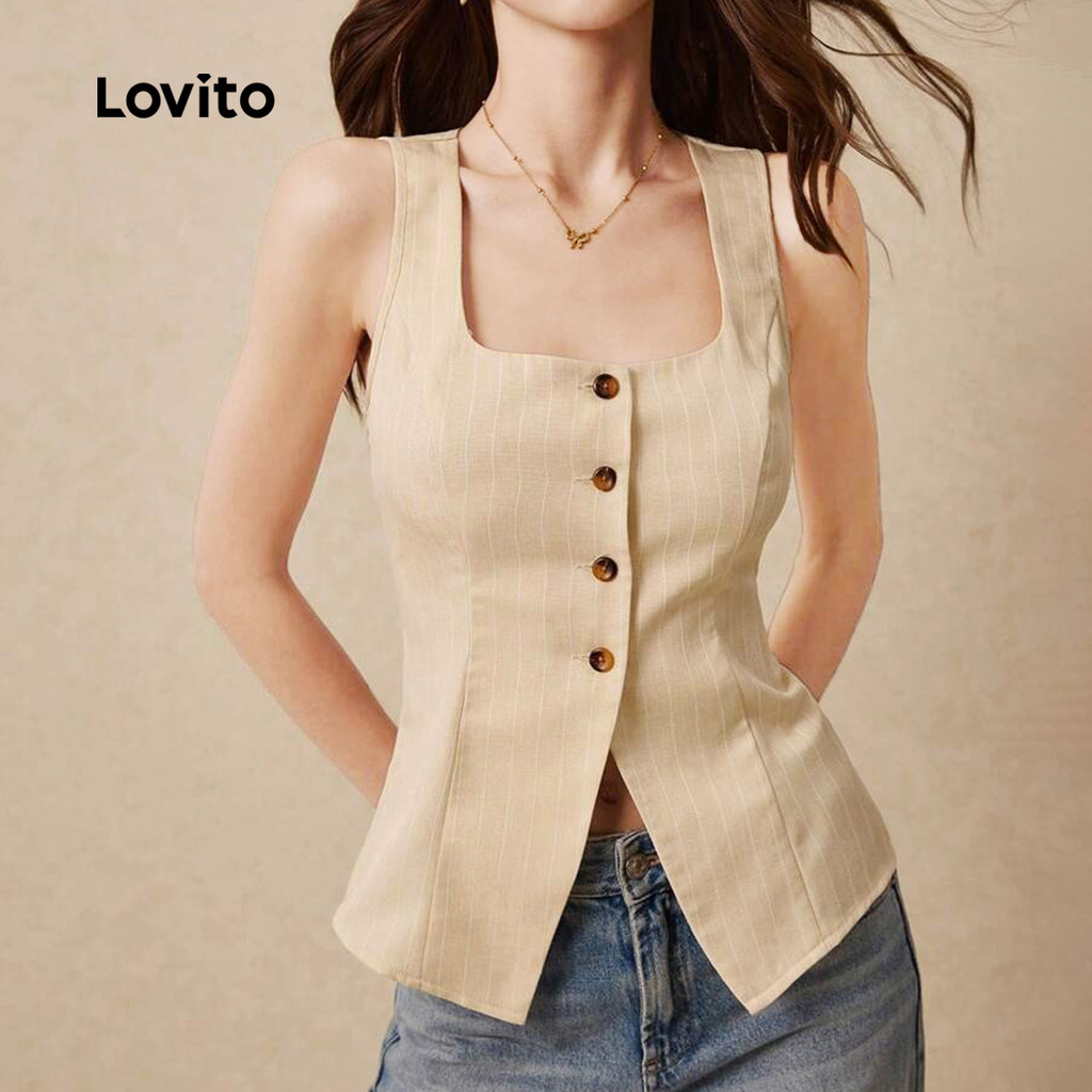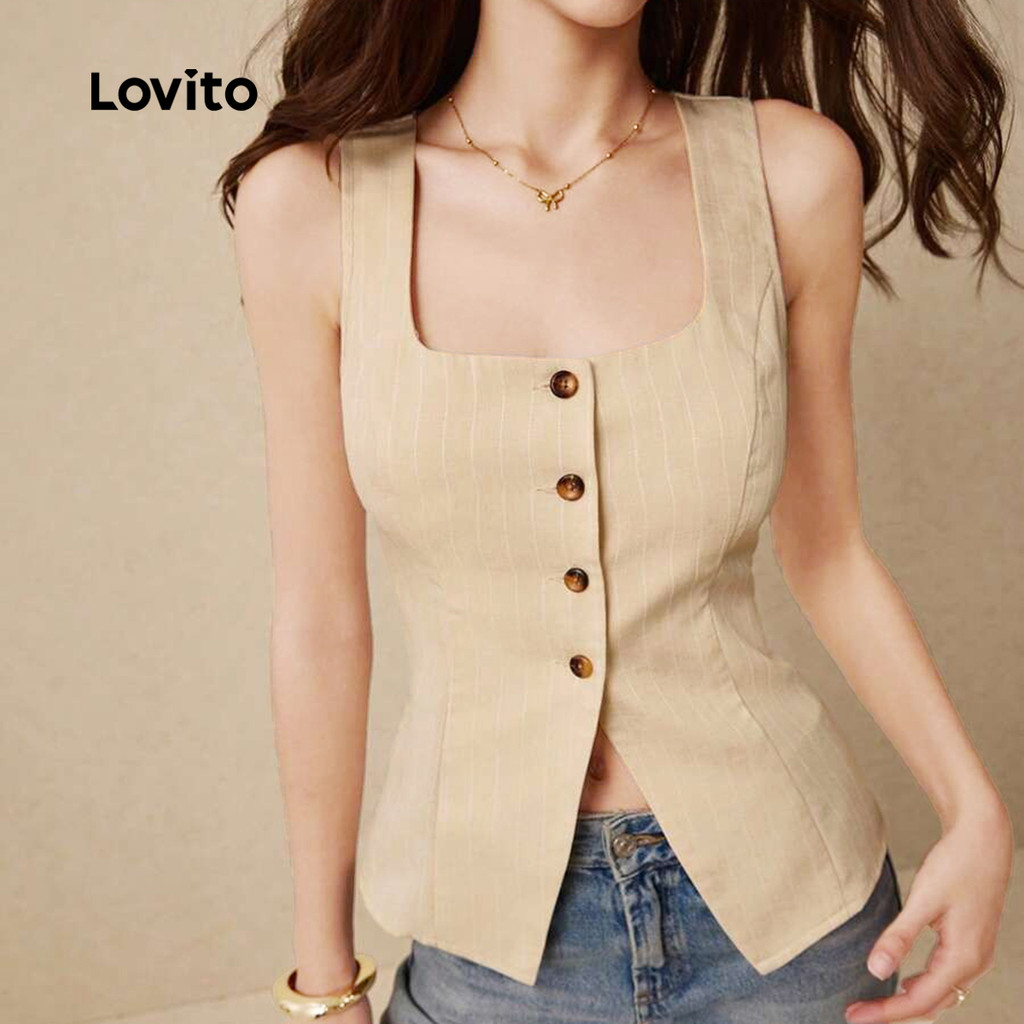 Lovito Blusa Casual Com Botões E Abertura Frontal, Primavera/verão, Cáqui, Para Mulheres L138AD852