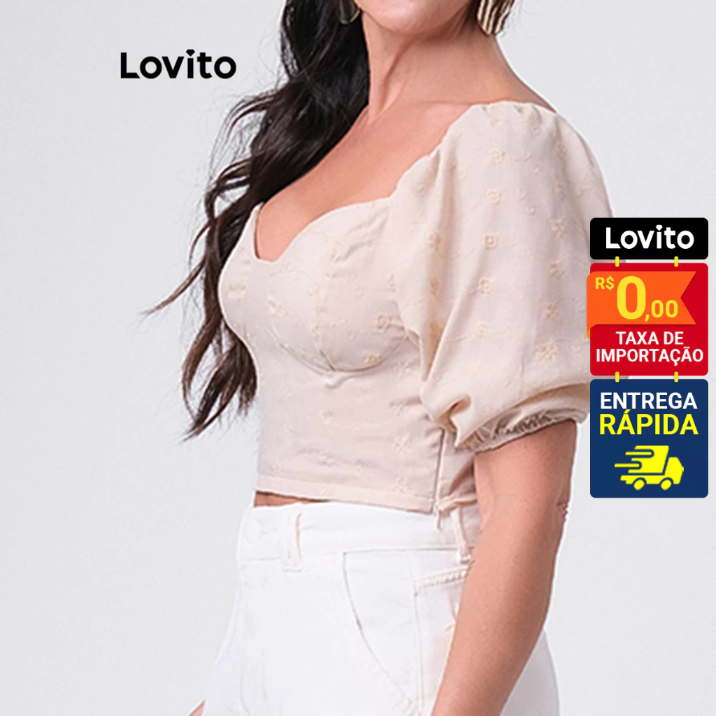 Lovito Blusa Decote Coração Manga Bufante Cropped Elegante Basica Feminina LB246BRL275
