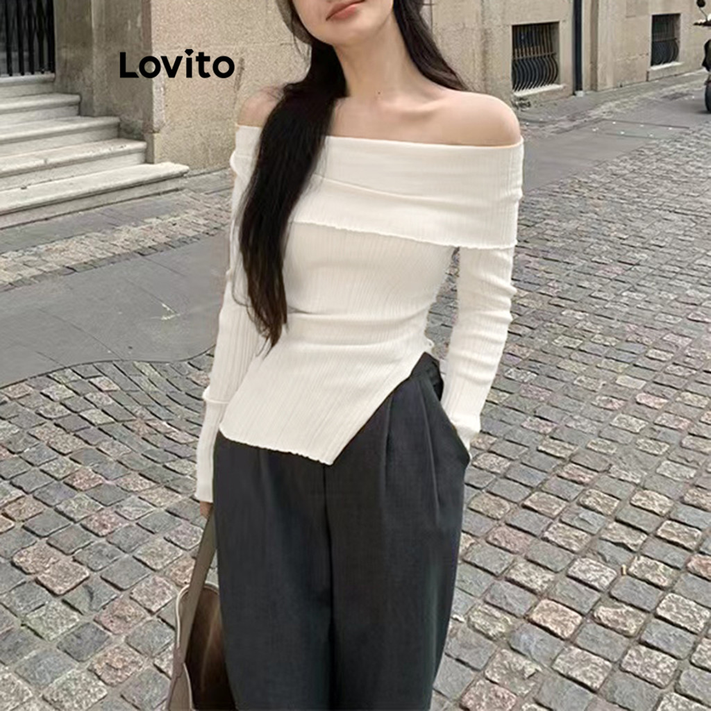 Blusa Feminina Casual Lovito Lisa Frente Dividida Ombro Frio LNA30014
