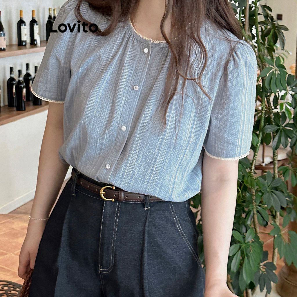 Lovito Blusa Feminina Casual Listrada com Botões para o Verão L99ED673