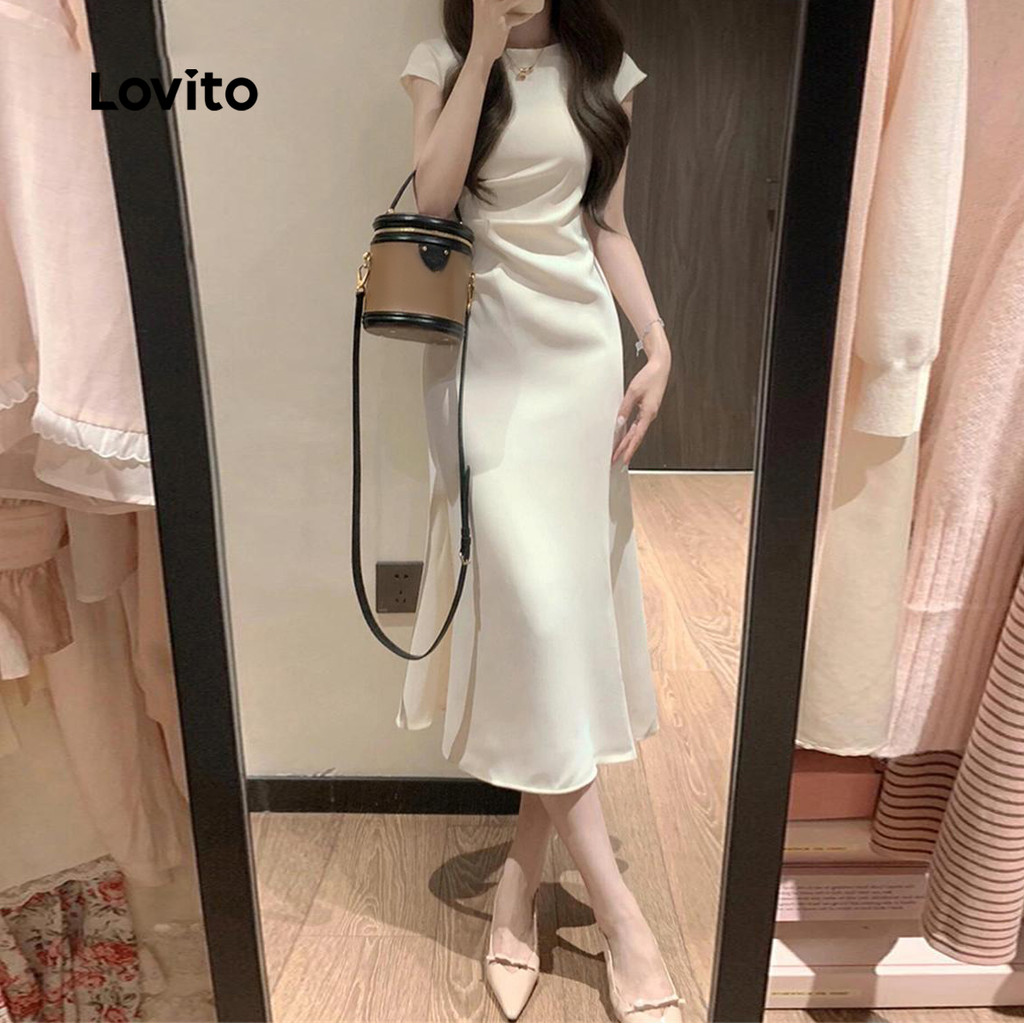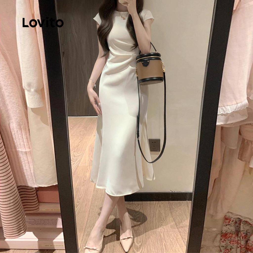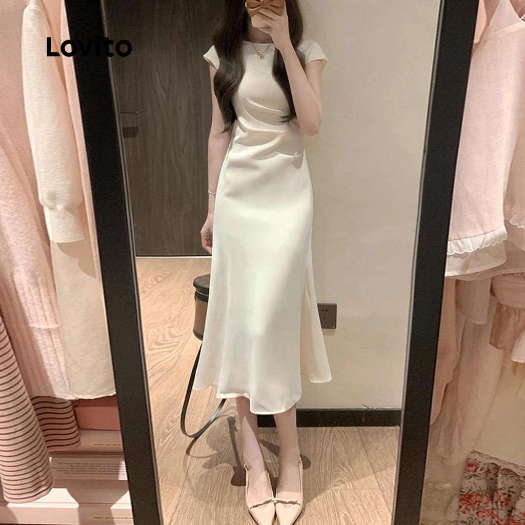 Lovito Vestido Feminino Plissado Liso Elegante para Mulheres LNE72538