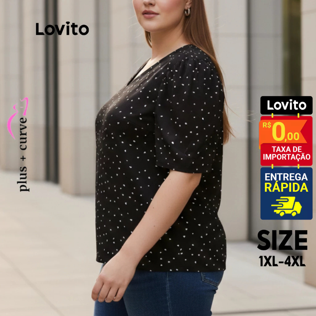 Lovito Blusa Feminina Plus Size Manga Curta Decote V Estampa Coração LB35BRL064