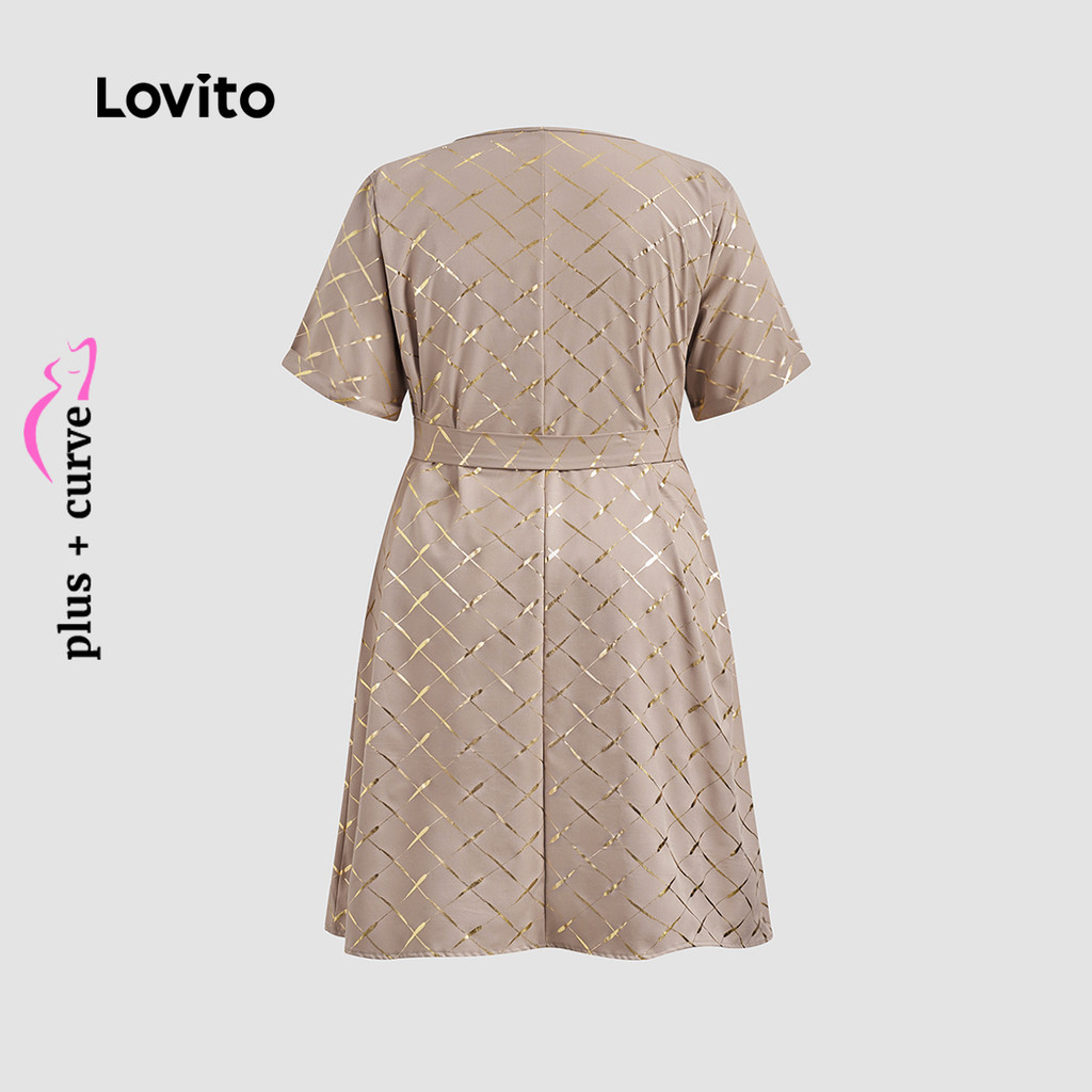 Lovito Vestido Casual Curva Plus Size, Textura Geométrica, Cinto De Metal, Verão/Primavera, Para Mulheres LBL23793