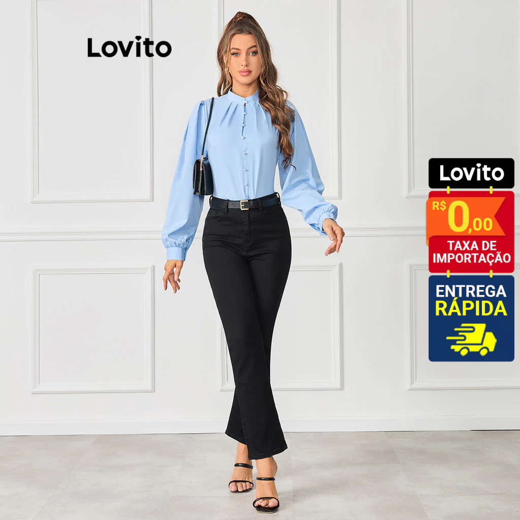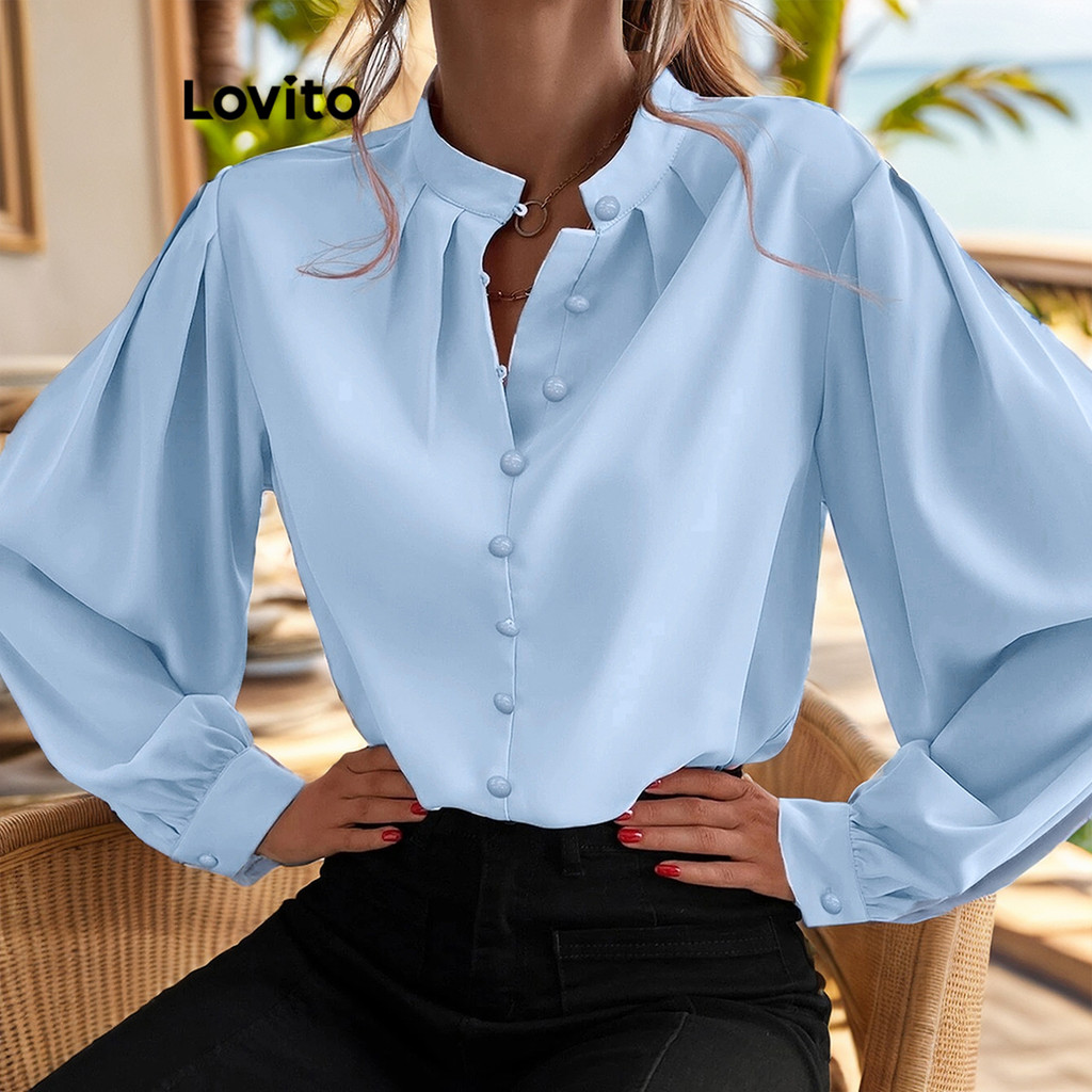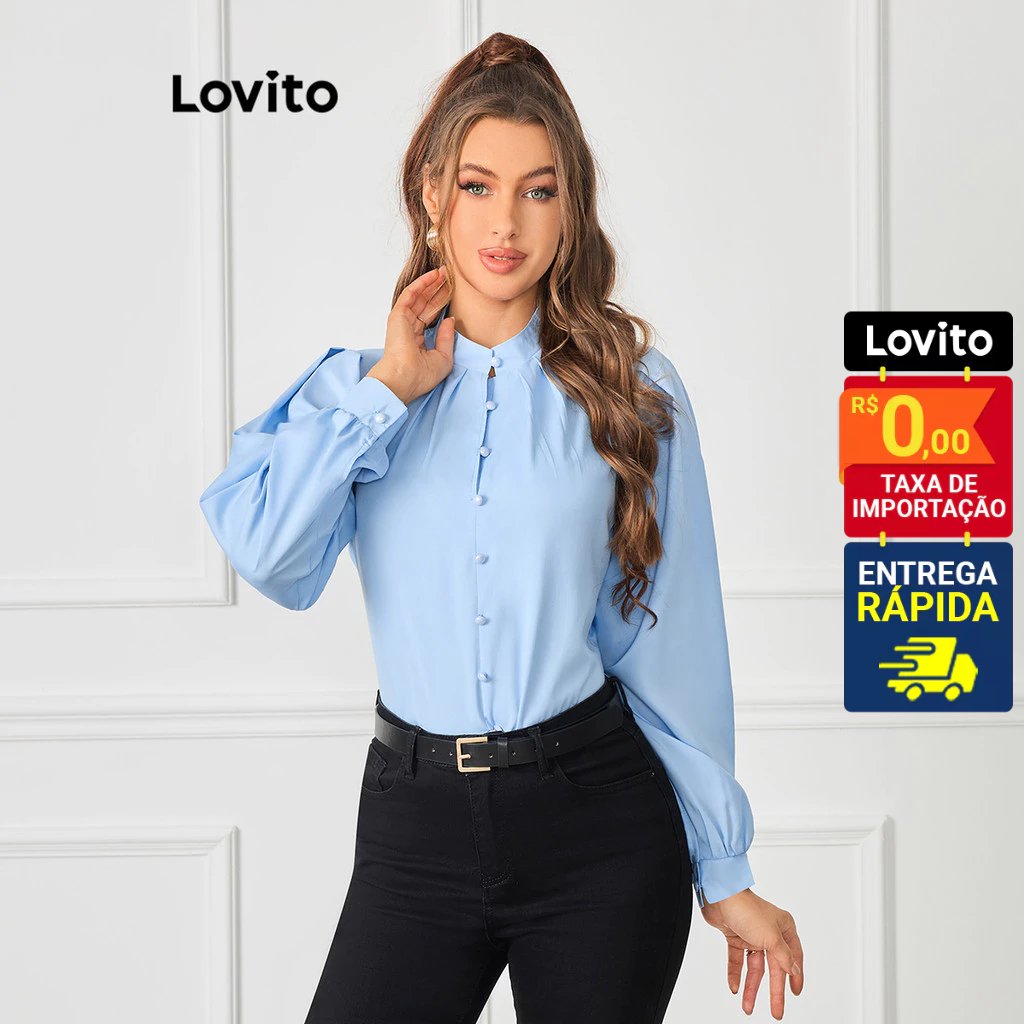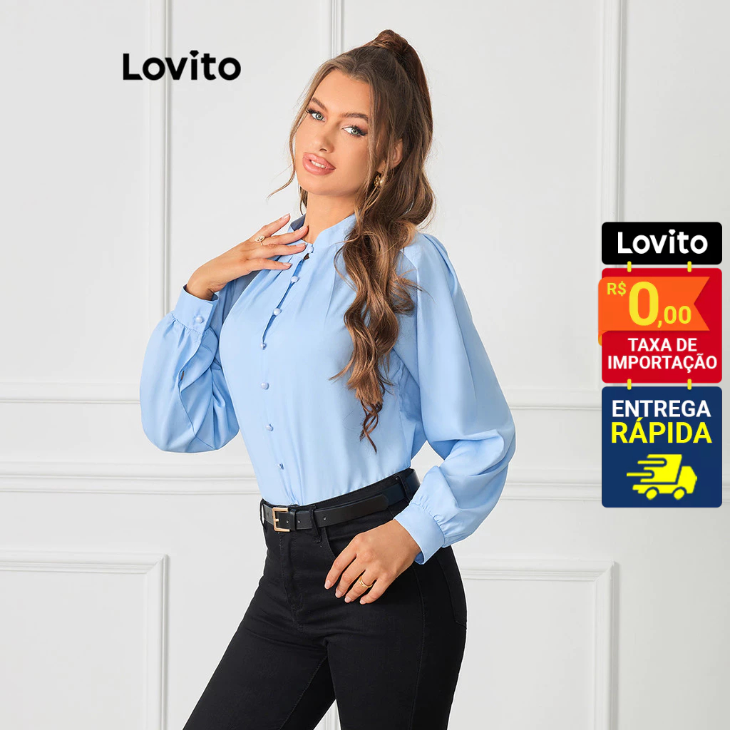 Lovito Blusa de Manga Longa Bufante com Vista com Botões e Gola Padra LBL10168