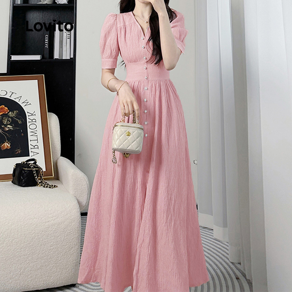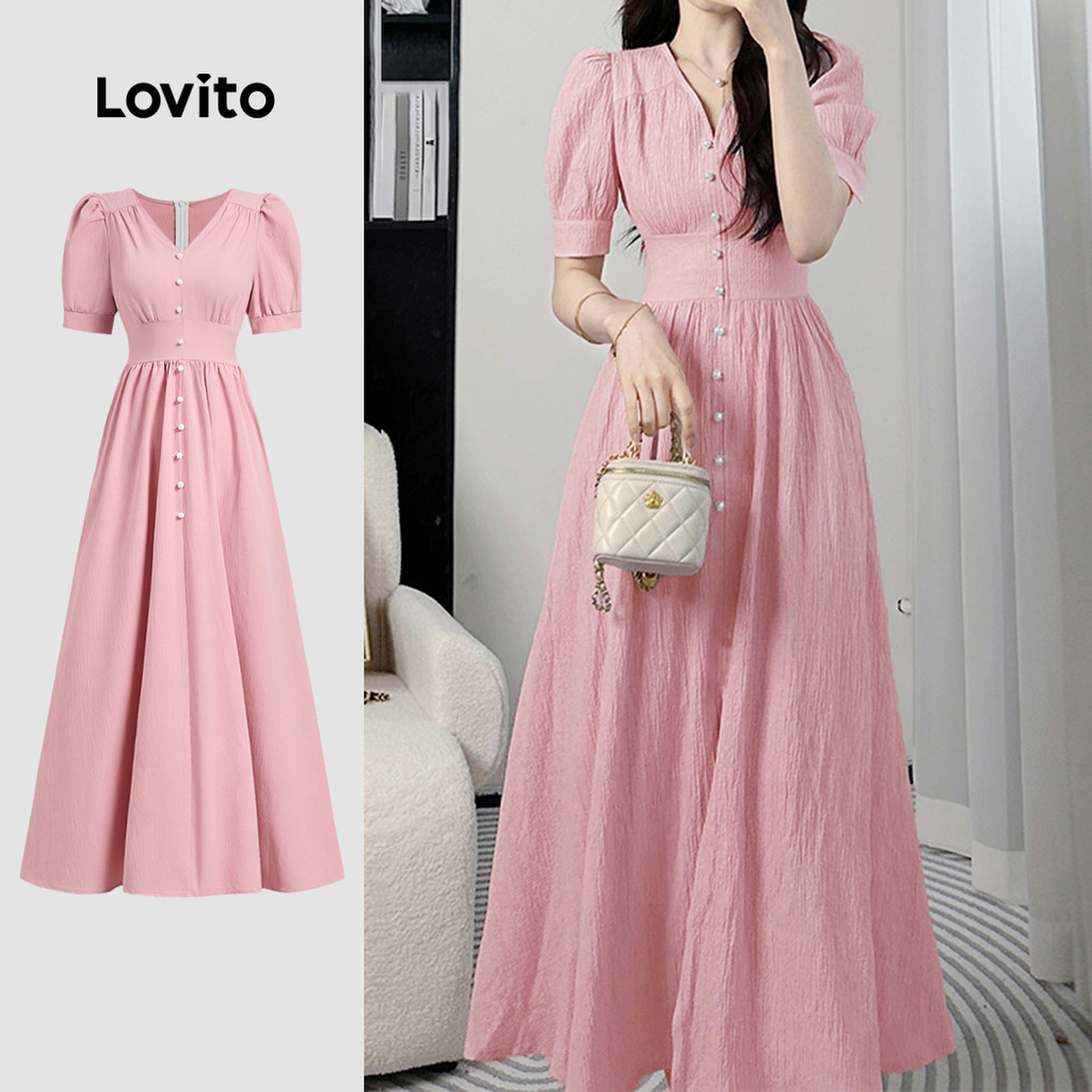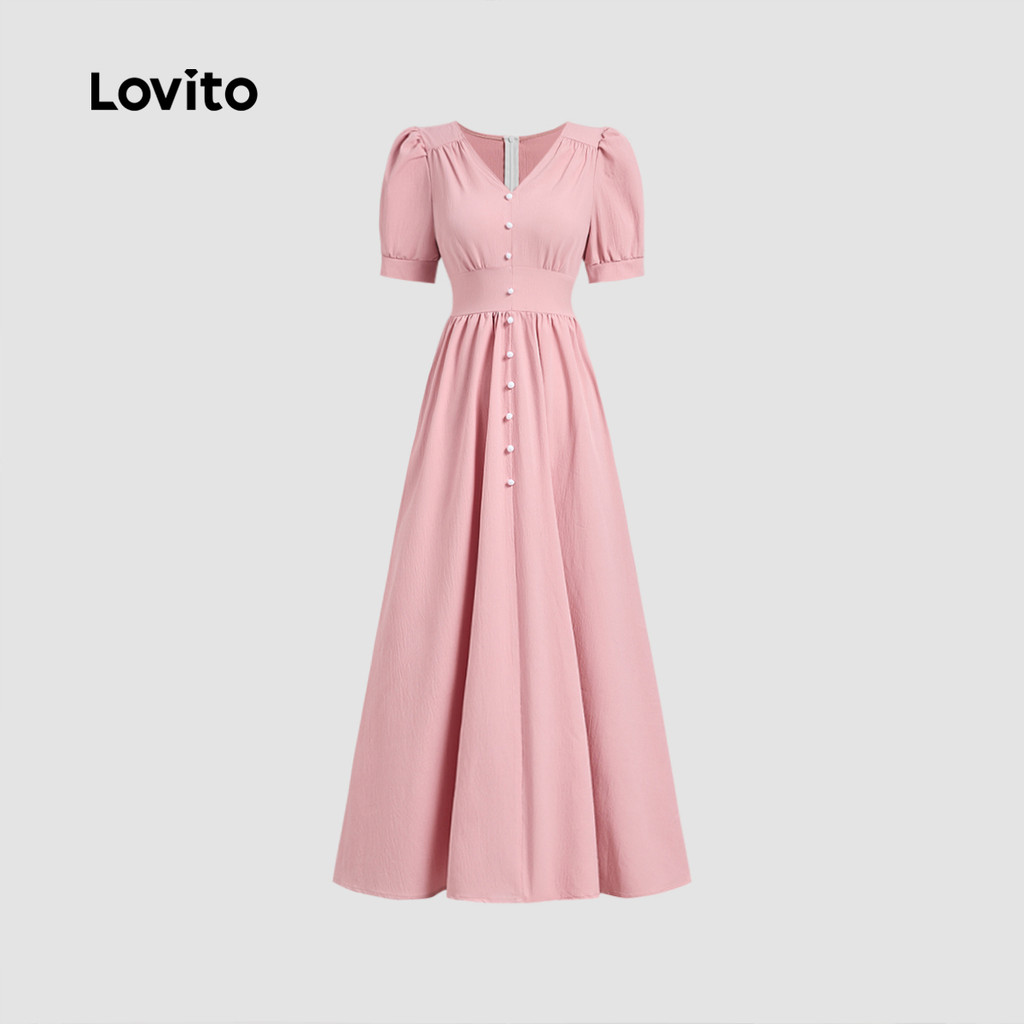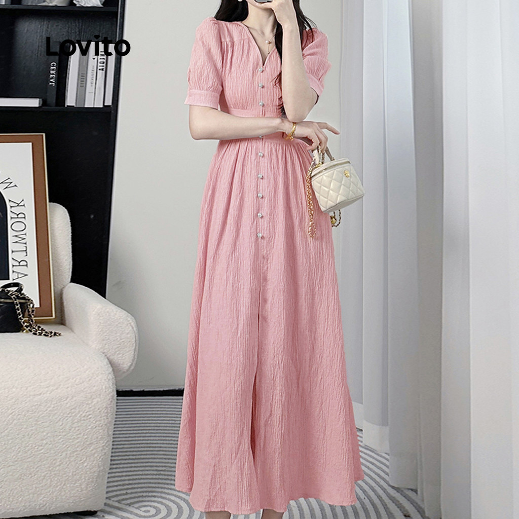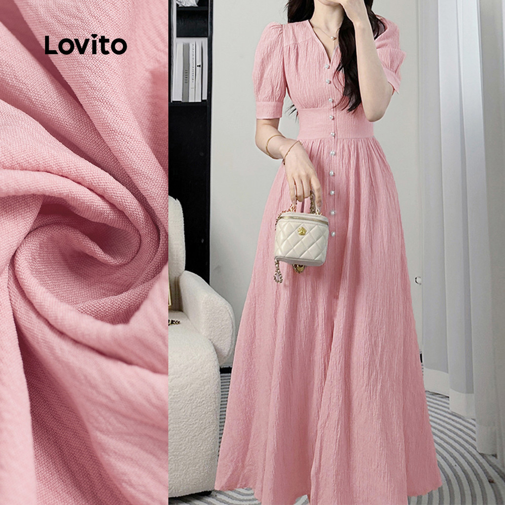 Lovito Vestido Casual Liso Plissado Verão Primavera Rosa Para Mulheres L132ED074