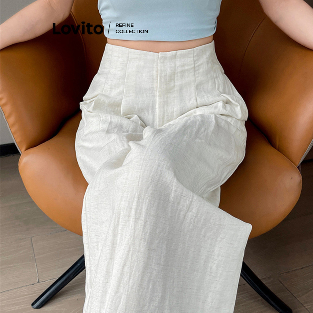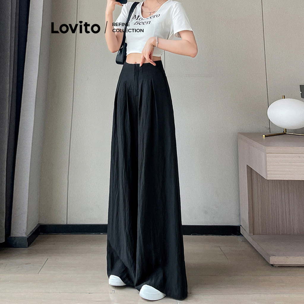 (Lovito Refine) Calça casual plissada lisa para mulheres LNE77778