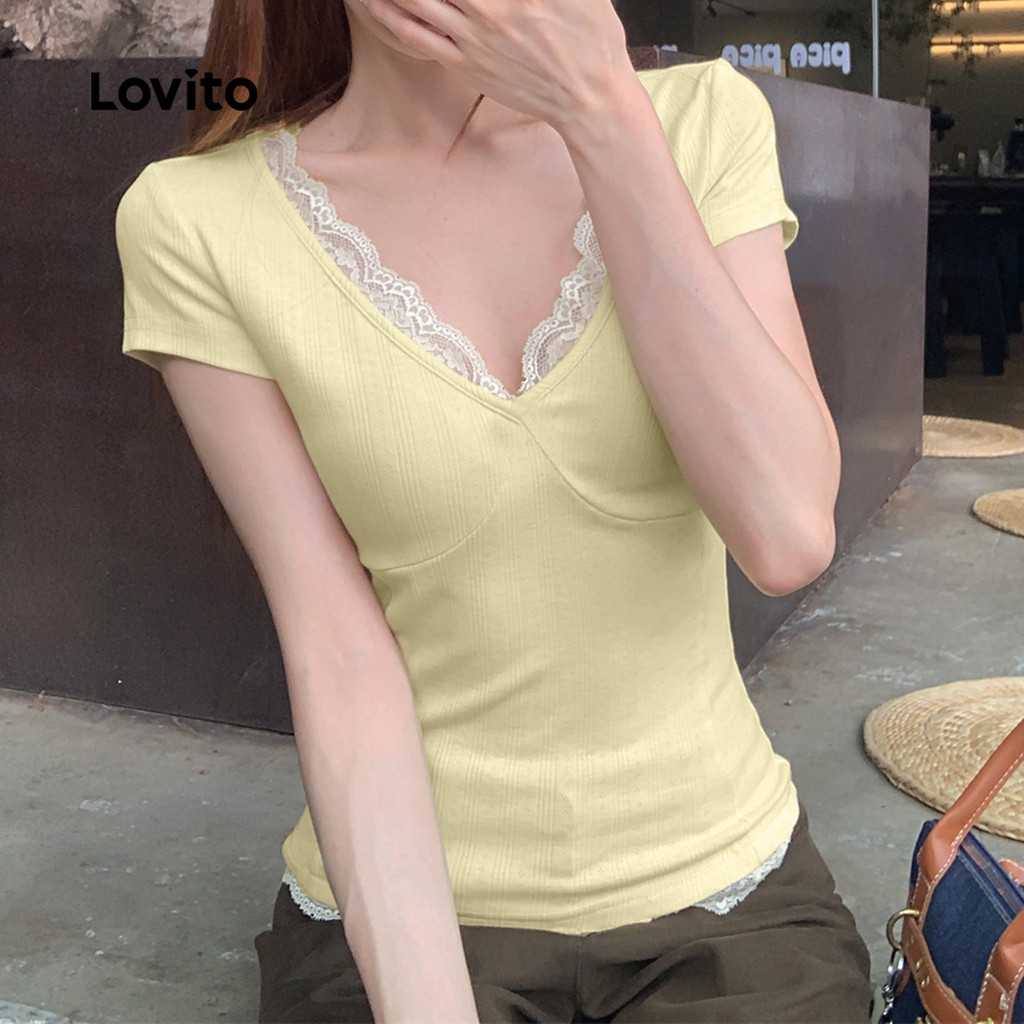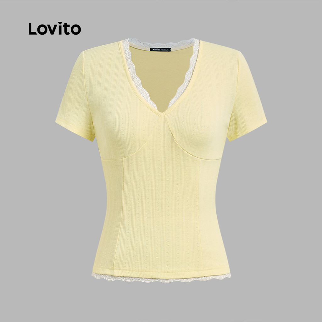 Lovito Camisa Casual de Renda Confortável Primavera/verão Camisa Amarela para Mulheres L156AD215