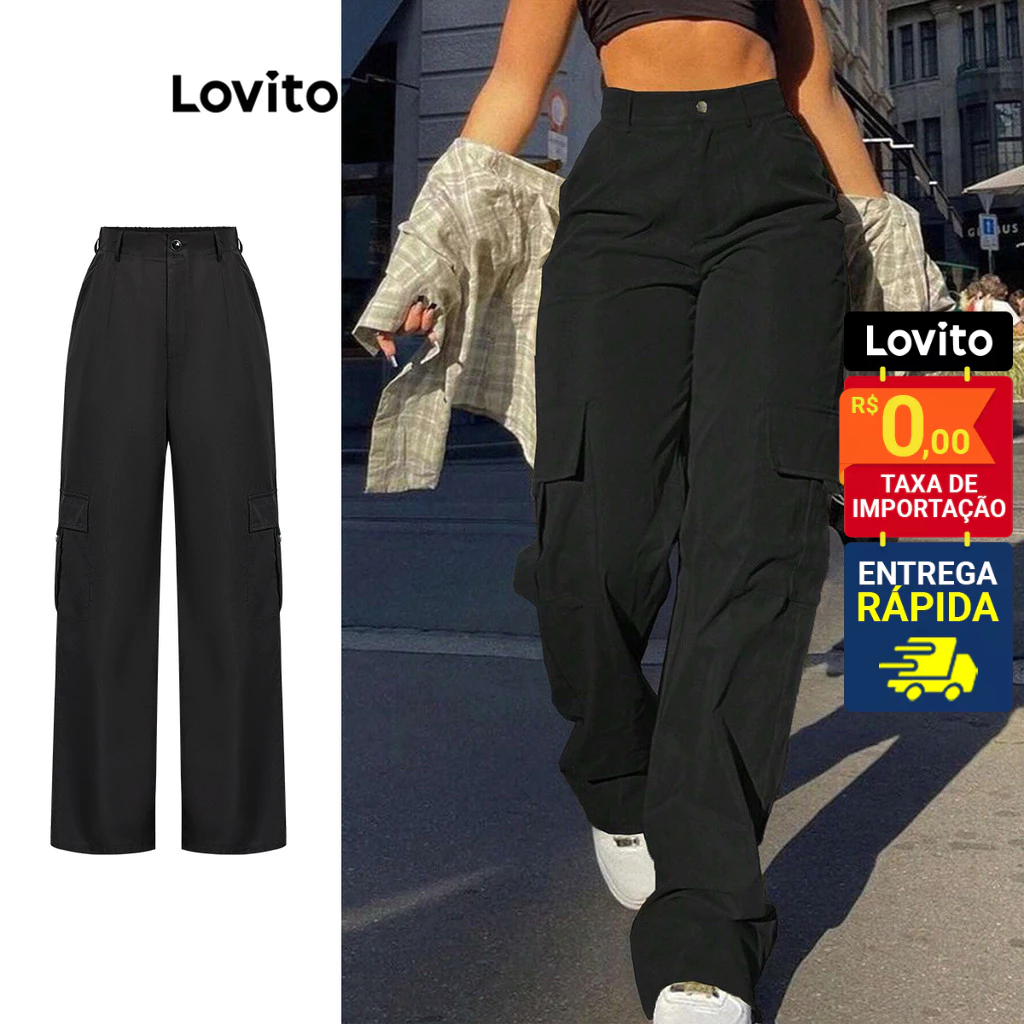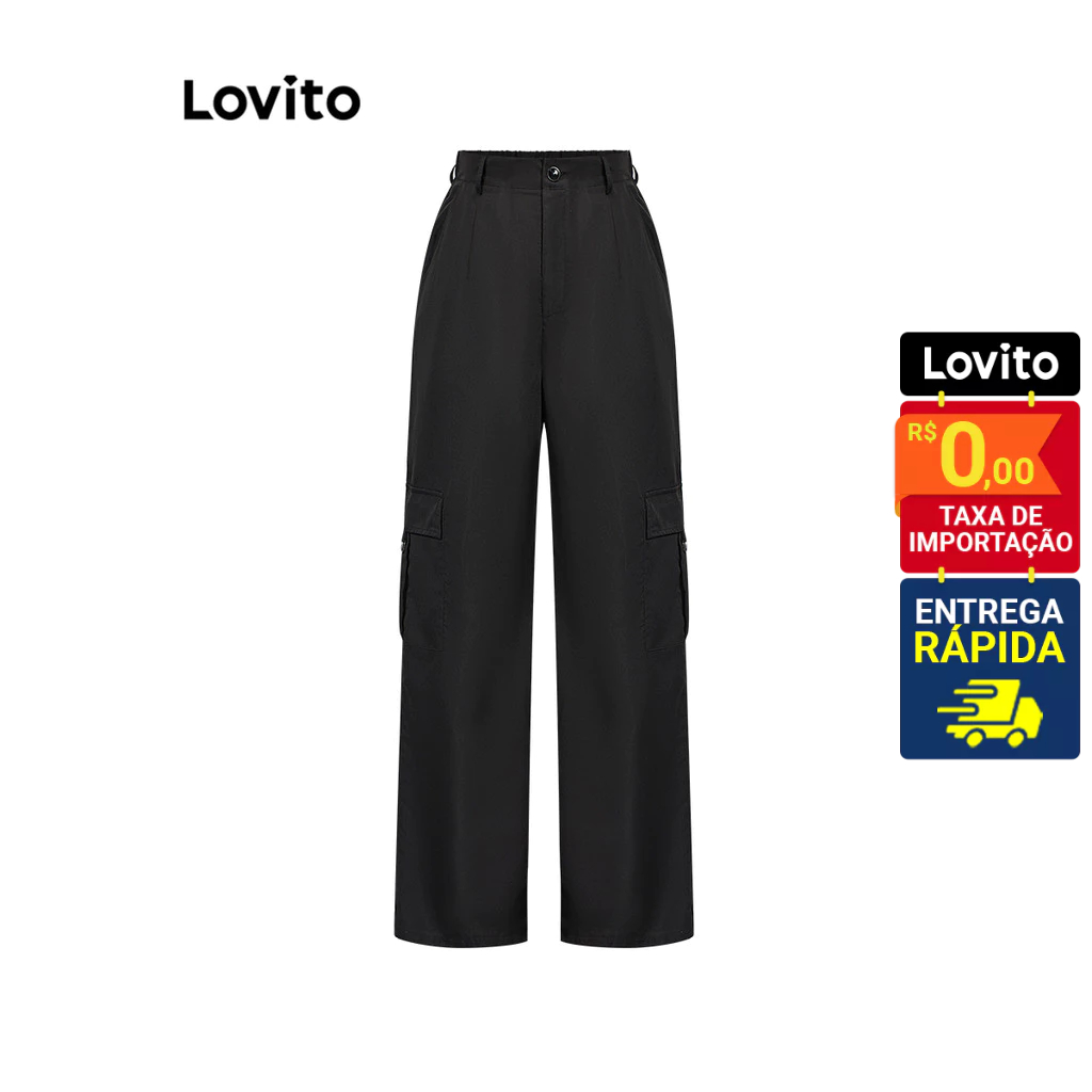 Lovito Calça Feminina Wide-Leg com Bolso Lateral L86ED100