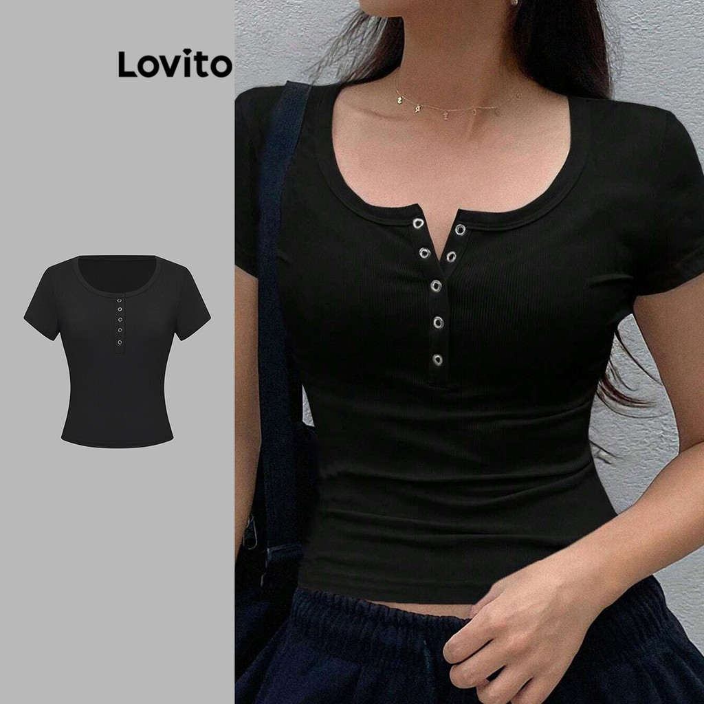 (Trendy) Lovito Camiseta Casual Com Botões Lisos E Canelados Para Mulheres L106AD194