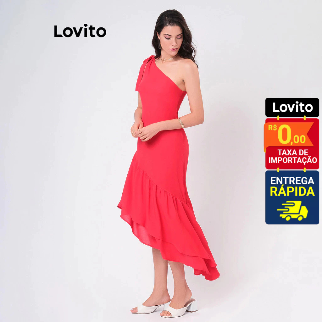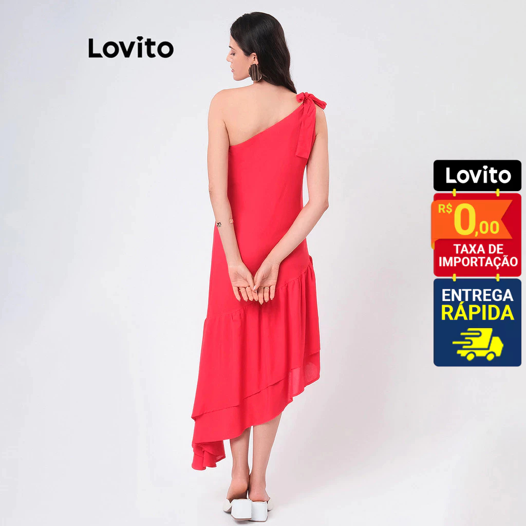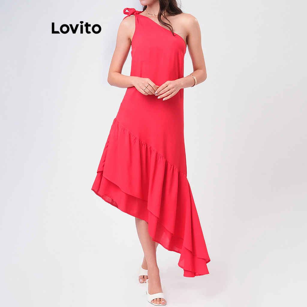 Lovito Vestido Natal Vermelho Um Ombro Só Assimetrico com Babado Midi Feminino LBRL042