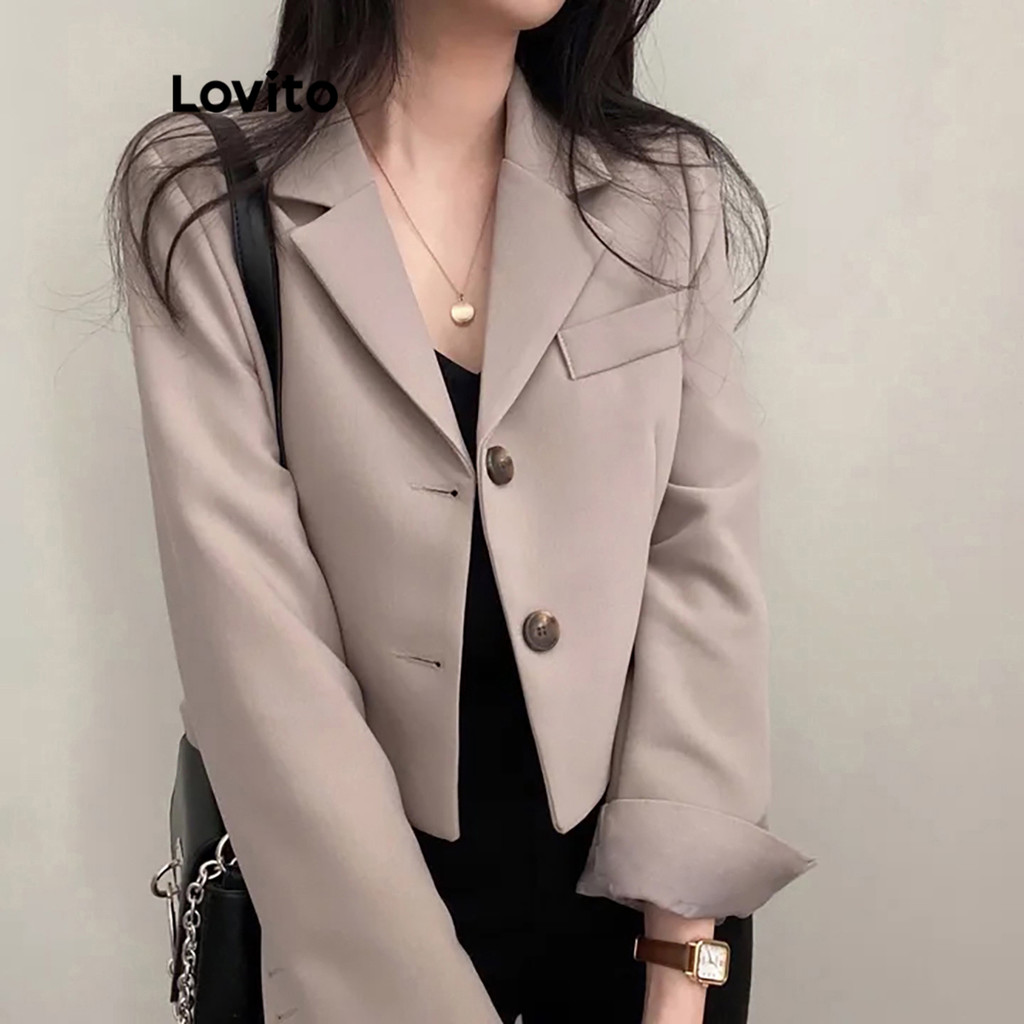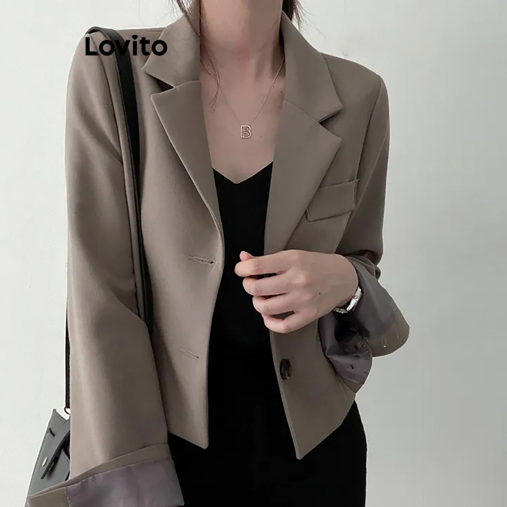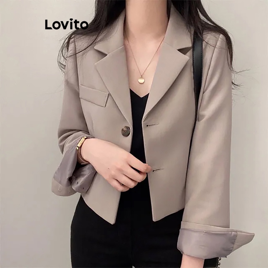 (Hot) Lovito Blazer Casual Com Botão Liso E Bolso Para Mulheres LNE36029 (Cáqui/Cinza/Branco Off/Preto)