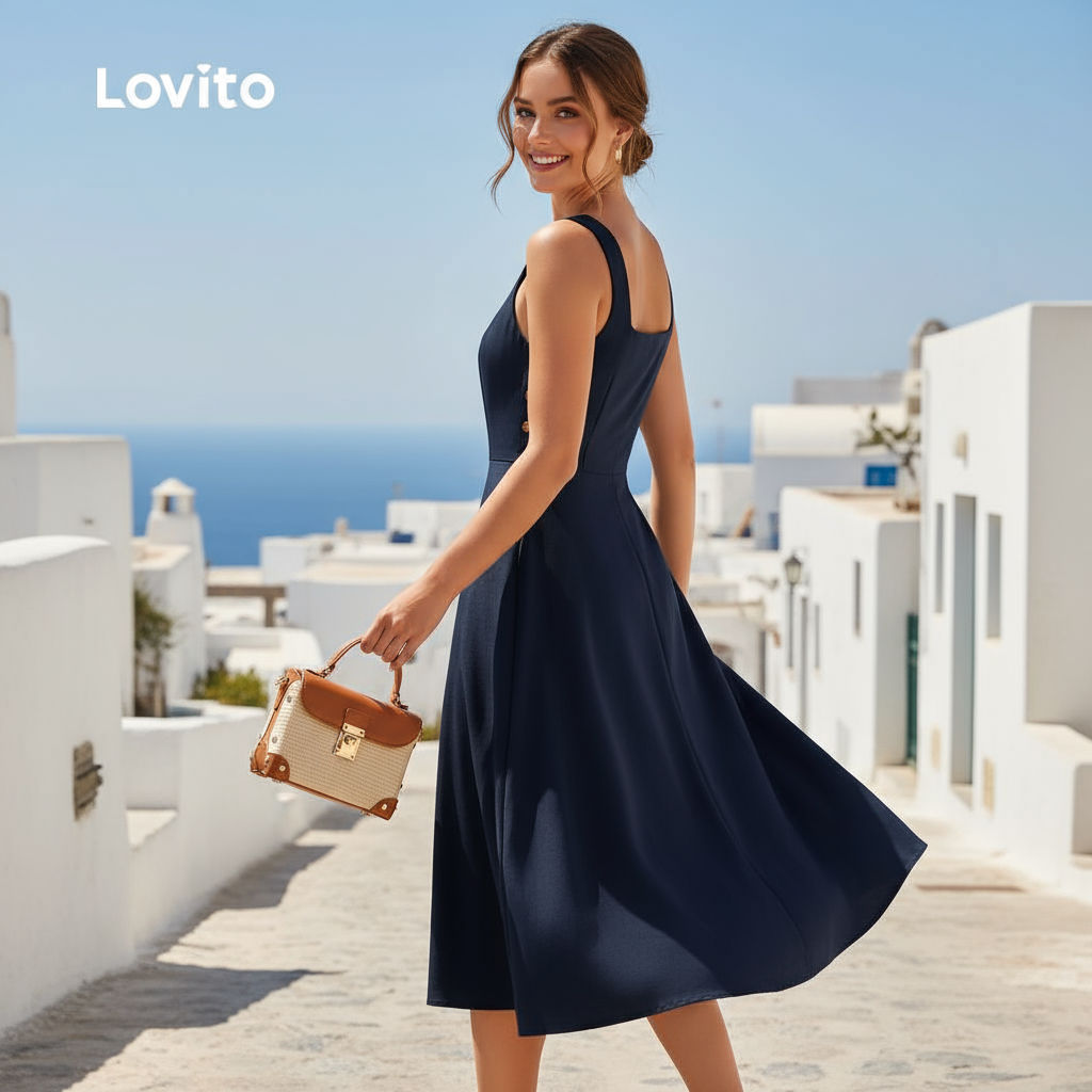 Lovito Vestido Elegante de Bolso com Estrutura de Botões Primavera/verão Azul Marinho LBL26228