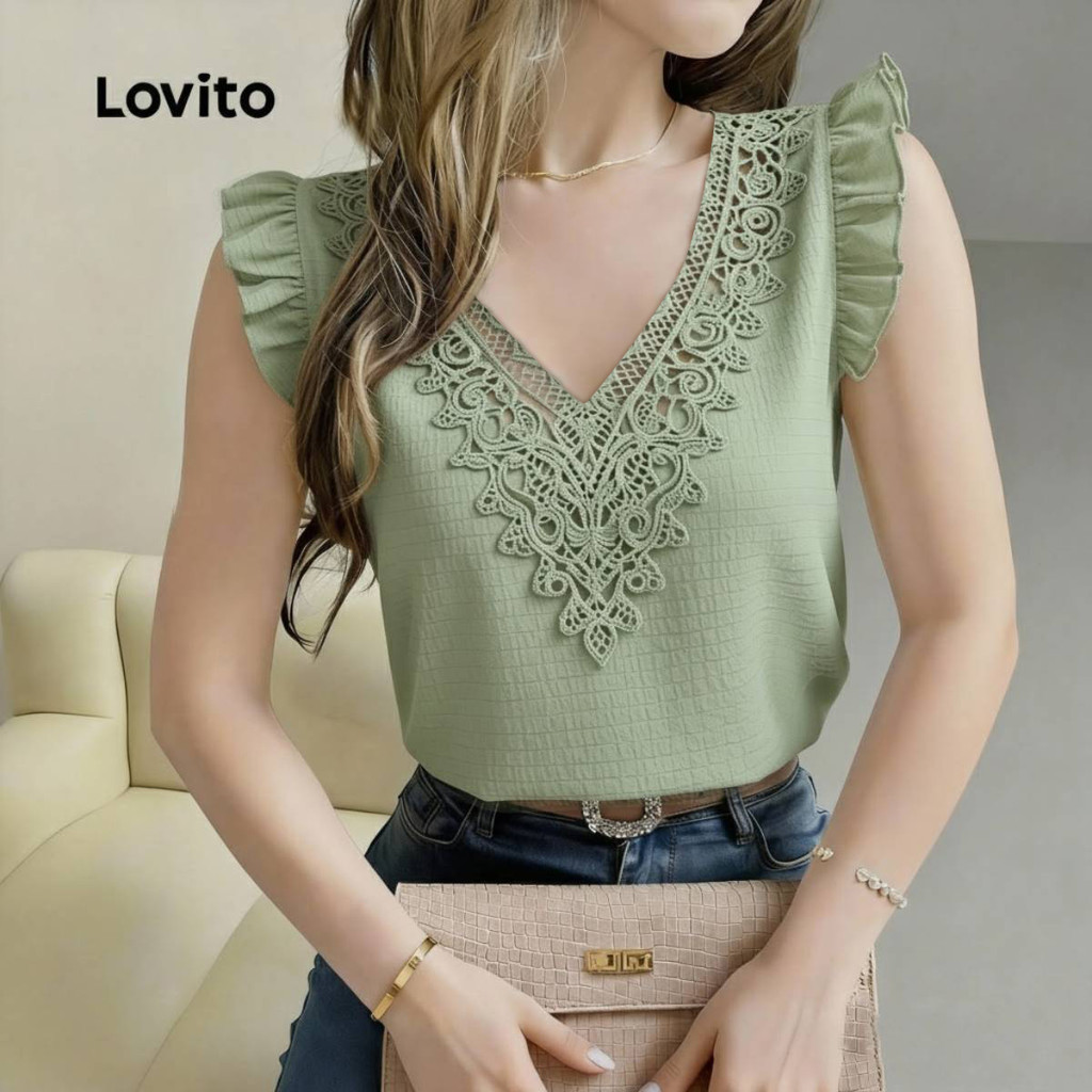 Lovito Blusa Casual com Babados No Pescoço para Primavera/verão Blusa Verde para Mulheres L164ED178