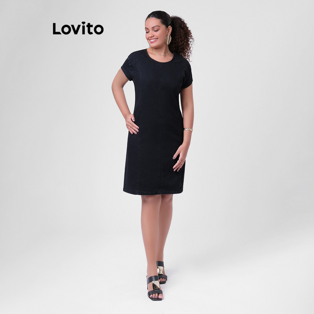 Lovito Vestido Plus Size Jeans Manga Curta com Ziper Feminino LB179BRL208