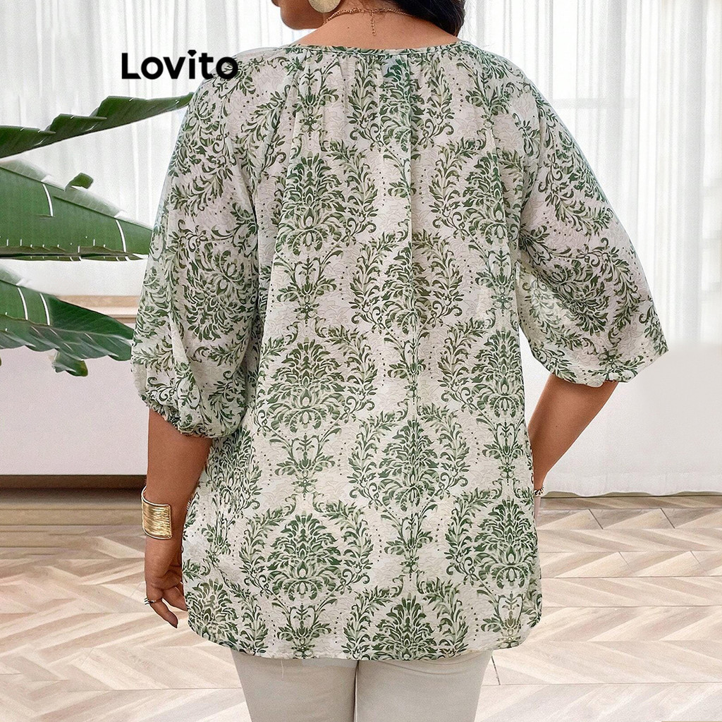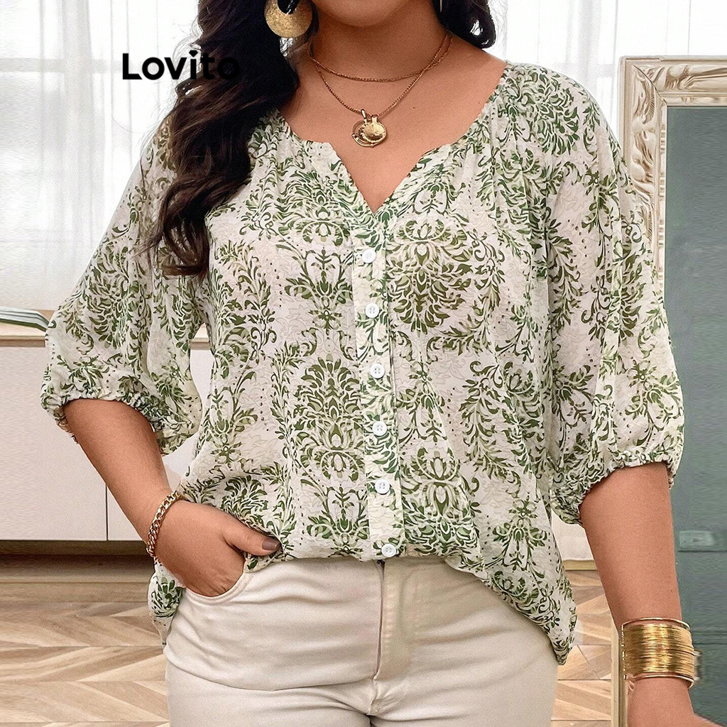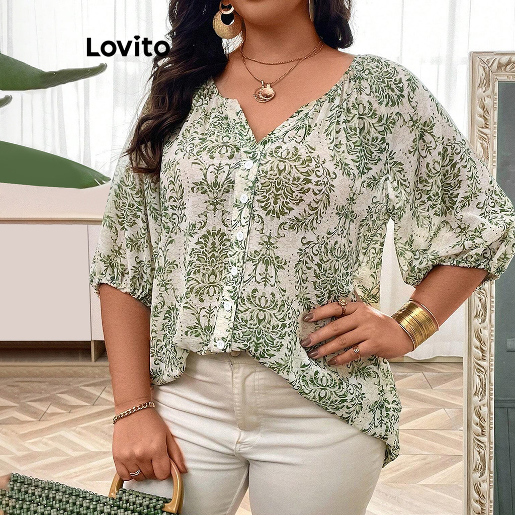 Lovito Blusa Casual Curva Plus Size Verão/Primavera Blusa Frontal Com Botão Estampado Tribal Para Mulheres LBL21091