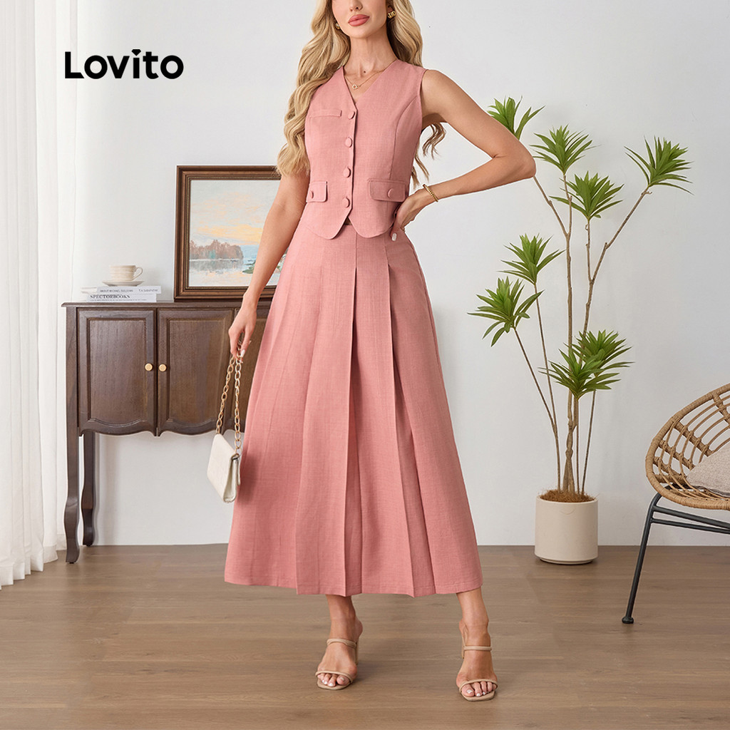 Lovito Tops Elegantes Femininos Botões Lisos Plissados Ou Calças De Verão/primavera LBL24158