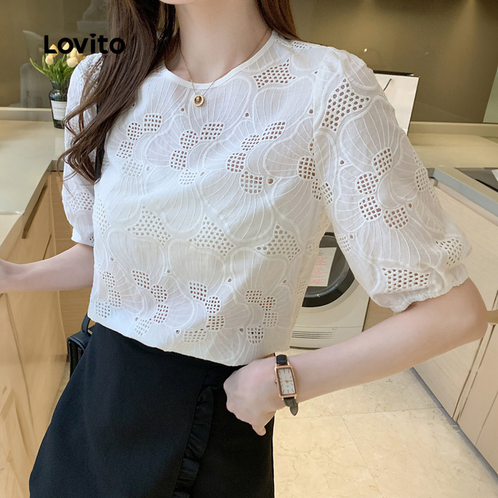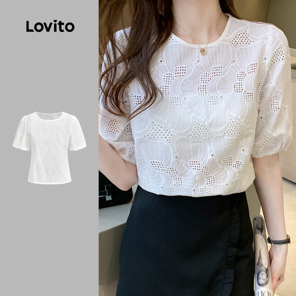 Lovito Blusa Casual Ilhó Bordado Lazer Estrutura Linha Primavera/Verão Blusa Branca Para Mulheres L135ED413