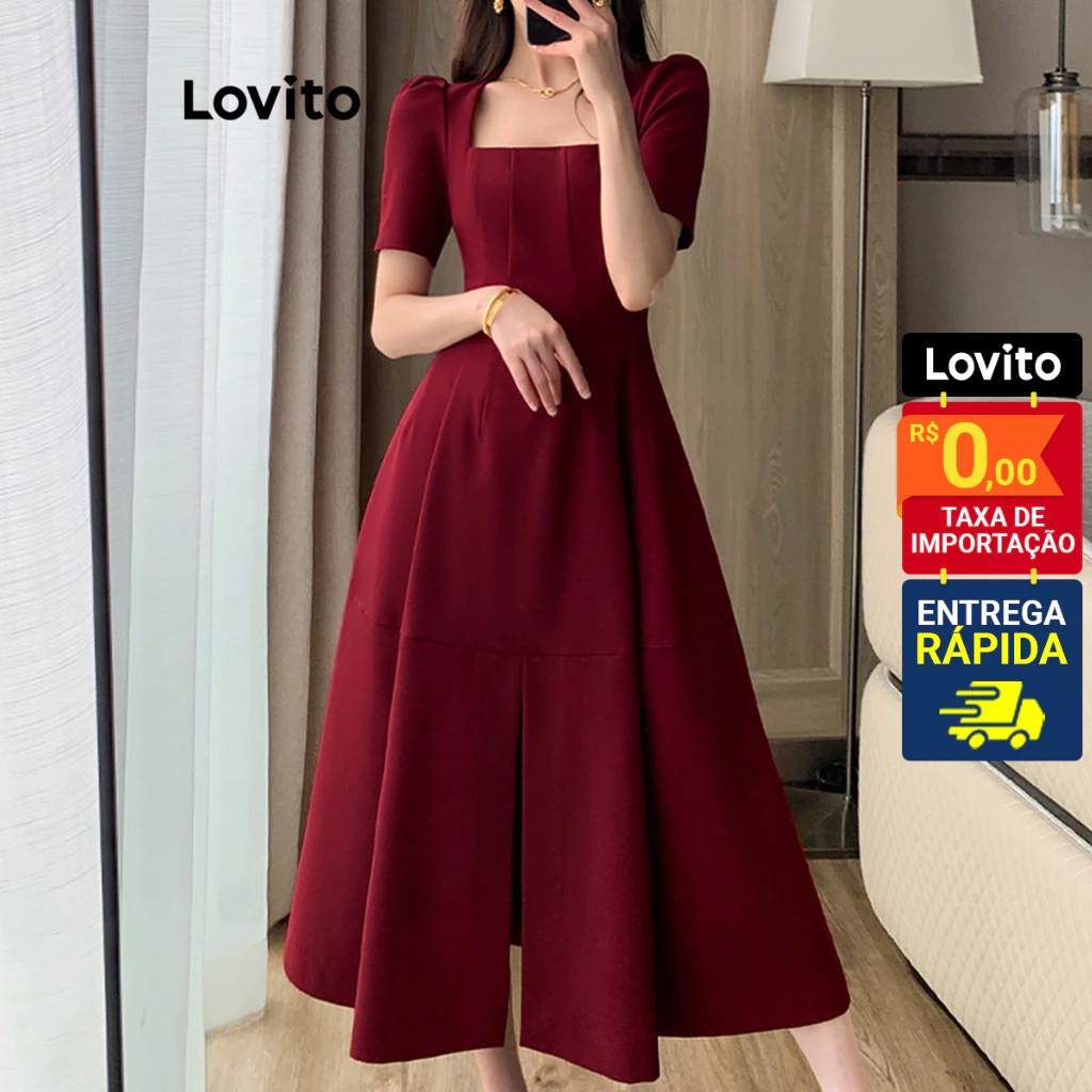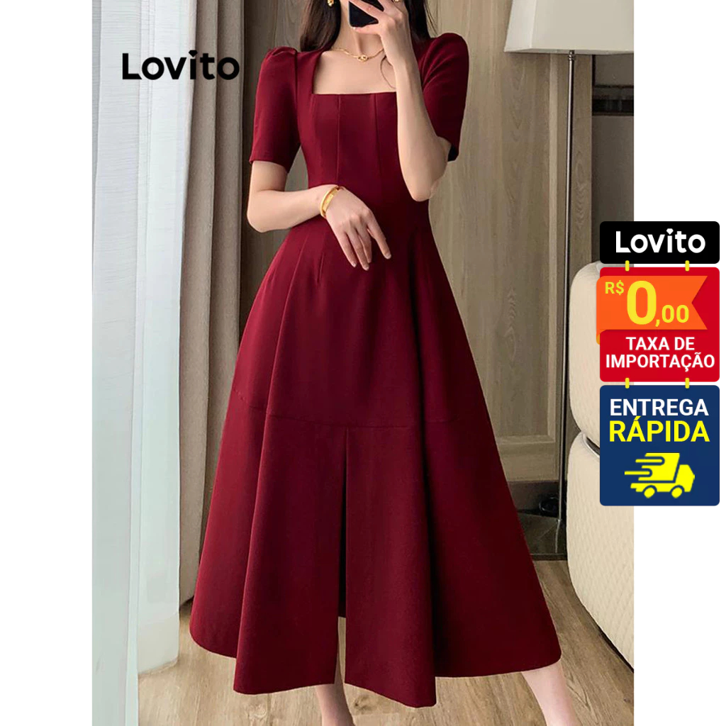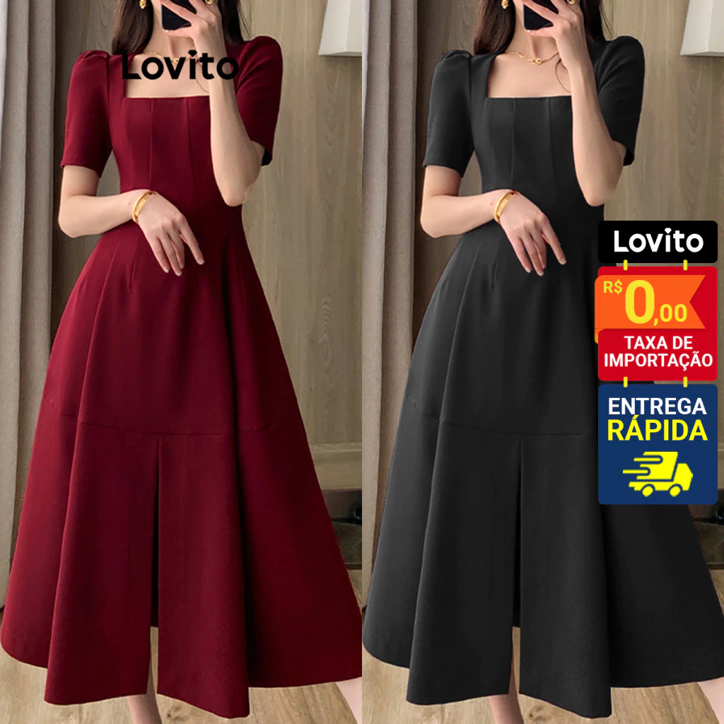 Lovito Vestido Feminino Midi Liso Decote Quadrado LNE27028